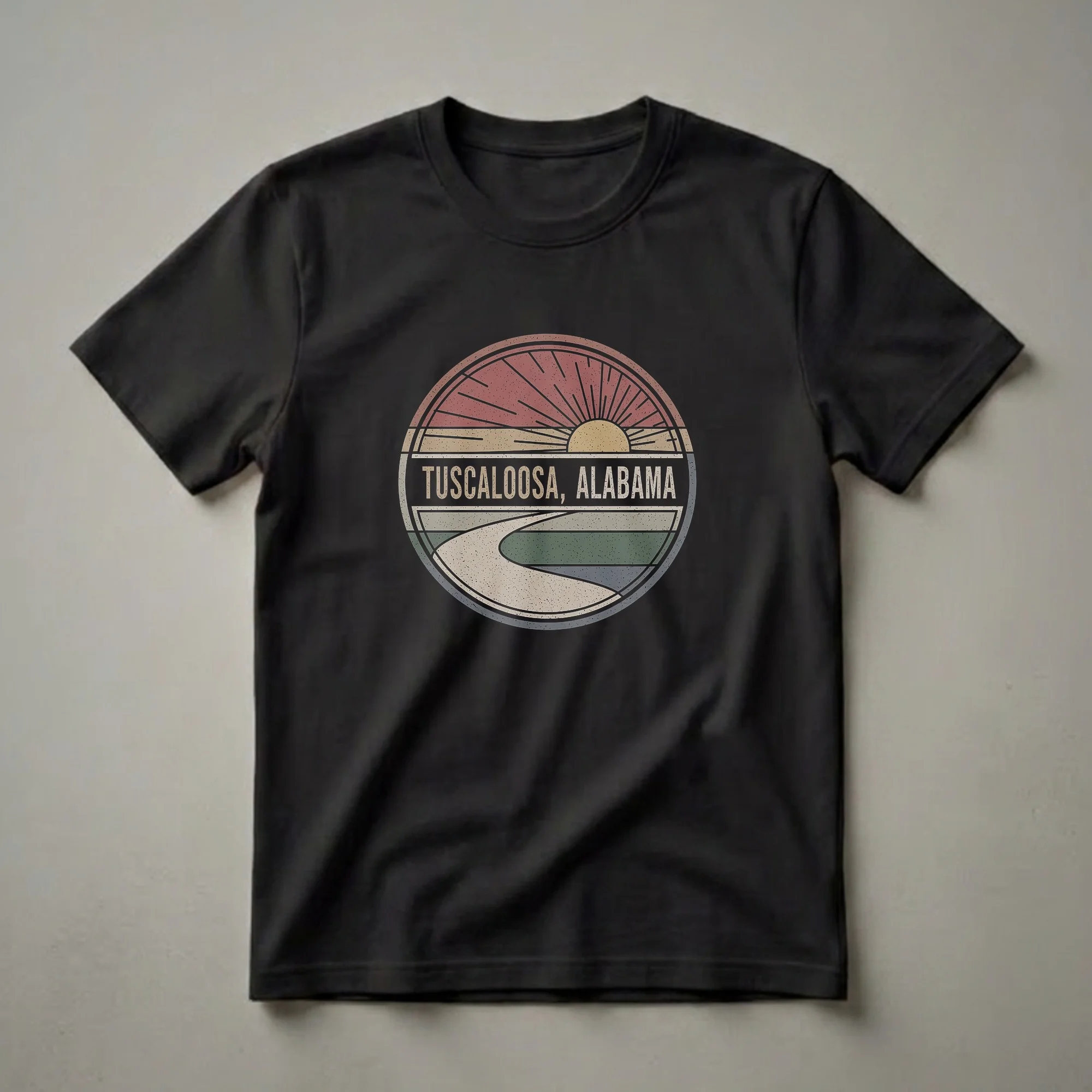 Tuscaloosa, Alabama residents and fans can now wear their pride with this striking retro graphic tee. The design features a circular emblem with a vintage sunset, complete with radiating lines and a warm gradient of reds and yellows. Below the sunset, the text "TUSCALOOSA, ALABAMA" is prominently displayed in a bold, retro font against a dark background. A winding road, rendered in muted earth tones of tan, green, and grey, curves through the landscape, evoking a sense of journey and nostalgia. This shirt is a thoughtful gift for anyone with a connection to Tuscaloosa, whether they are a current resident, a former student of the University of Alabama, or simply appreciate unique state-themed apparel. The distressed texture adds to the vintage aesthetic, making this t-shirt a go-to piece for casual outings or showing off hometown pride. Wear it to a local festival, a tailgate party, or simply while exploring the vibrant city of Tuscaloosa.