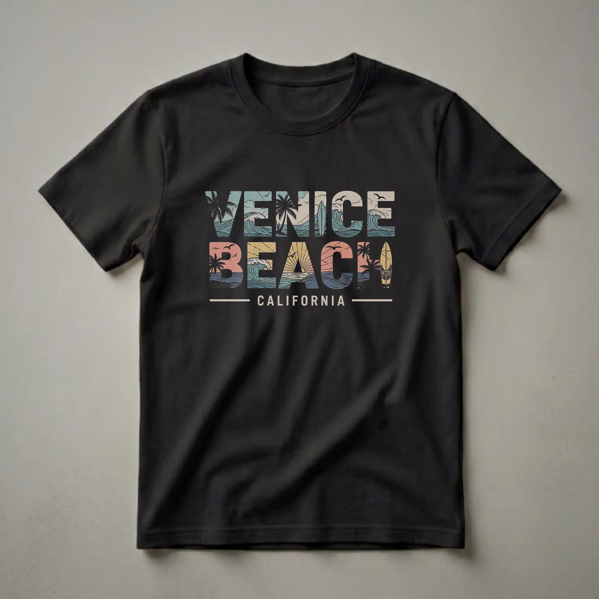 - Retro Venice Beach California graphic t-shirt for beach lovers.