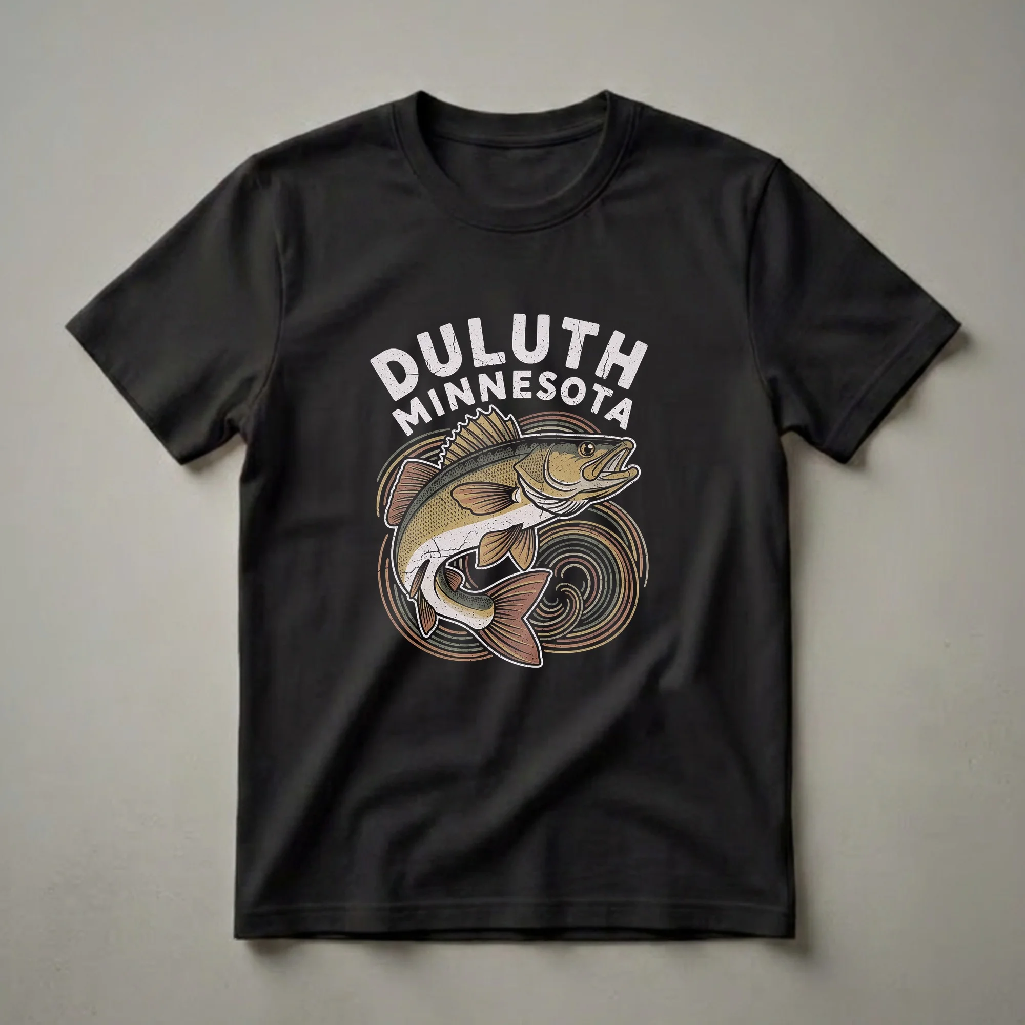 Duluth, Minnesota anglers will reach for this retro graphic tee to showcase their passion for fishing on the Great Lakes. The design features a striking walleye, a popular sport fish known for its aggressive nature and delicious taste, leaping from stylized water ripples. The distressed, vintage aesthetic evokes a classic feel, making this shirt a staple for anyone who loves the waters around Duluth. Minnesota is renowned for its abundant freshwater lakes, and the Duluth area offers exceptional opportunities for catching walleye, northern pike, and smallmouth bass. This t-shirt is a thoughtful gift for the fisherman or fisherwoman in your life who cherishes their time spent on Lake Superior or the St. Louis River. Wear it on your next fishing trip, to a casual outing, or while reminiscing about your biggest catch. This eye-catching shirt celebrates the spirit of Duluth's vibrant fishing culture.