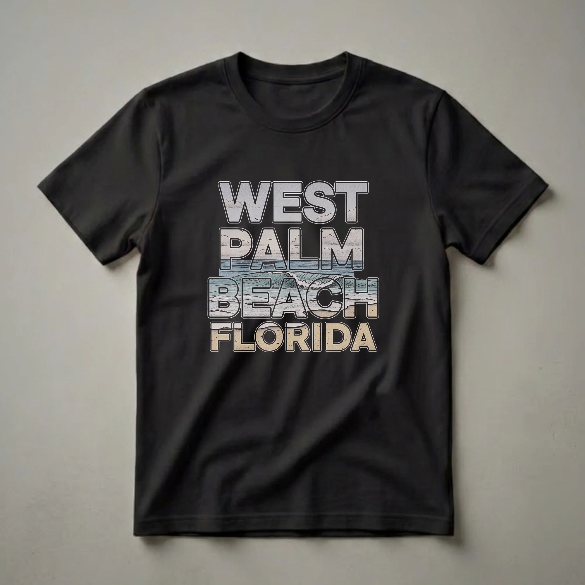 Travelers and residents who cherish the vibrant coastal atmosphere of West Palm Beach will reach for this unique graphic tee. The design features bold, retro-style lettering that spells out "WEST PALM BEACH FLORIDA." Within the letters, a stylized scene unfolds, depicting the iconic ocean waves crashing onto the shore, with a soft, cloudy sky above and sandy beach textures below. This visual captures the essence of a classic Florida beach day. West Palm Beach, located on Florida's Atlantic coast, is known for its beautiful beaches, upscale shopping, and cultural attractions, making it a popular destination for vacationers and a beloved home for its inhabitants. This shirt serves as a wearable memento of the city's charm. It makes a thoughtful gift for anyone who has fond memories of visiting or living in this picturesque South Florida locale. Wear this tee to casual outings, beach trips, or while reminiscing about sunny days spent by the ocean. It’s a comfortable and stylish way to express your connection to this beloved Florida city.
