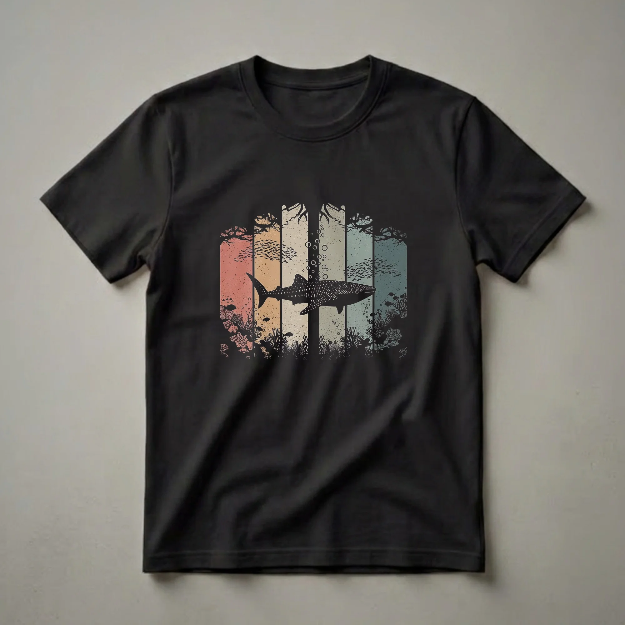 Embrace the mesmerizing beauty of the ocean with this retro whale shark graphic t-shirt, showcasing a vintage sunset-inspired underwater scene.The design features a detailed silhouette of a whale shark, instantly recognizable by its distinctive spotted pattern and broad mouth. It swims through a vibrant underwater scene, rendered in a retro, sunset-inspired color palette of muted oranges, tans, greens, and blues. Vertical stripes create a stylized backdrop, reminiscent of a vintage travel poster. Small schools of fish dart through the water, while intricate coral formations and bubbles add depth to the composition. Whale sharks, the largest fish in the sea, are filter feeders found in tropical and warm-temperate oceans. They are known for their docile nature, making them a symbol of the ocean's majesty and mystery. This graphic tee is a thoughtful gift for anyone fascinated by oceanography, diving, or simply the beauty of marine ecosystems. Wear it to your next beach outing, a casual day out, or while exploring coastal towns to express your passion for these incredible creatures. This shirt is a staple for any ocean lover's wardrobe.