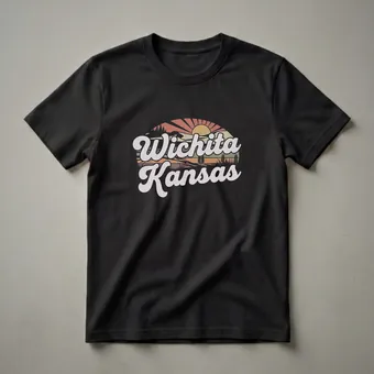 Wichita, Kansas residents and visitors alike can embrace their love for the Sunflower State with this retro-inspired graphic t-shirt. The design features a stylized sunset over a landscape that evokes the central plains, complete with rolling hills, silhouetted trees, and stalks of wheat, symbolizing Kansas's agricultural heritage. The words 'Wichita Kansas' are prominently displayed in a classic script font, giving it a vintage feel that appeals to those who appreciate nostalgia and local pride. This tee works well for anyone who calls Wichita home or has fond memories of visiting the city. It’s a thoughtful gift for a friend or family member who has a connection to Wichita, perhaps for a birthday or just to show you care. Wear this shirt to casual outings, local events, or while exploring the city to showcase your Wichita spirit. The design captures the essence of the region, making it a unique piece of apparel for any wardrobe. It's a staple in the collection for those who want to represent their hometown or state with a touch of retro flair. This shirt is a go-to tee for casual wear and a great conversation starter.