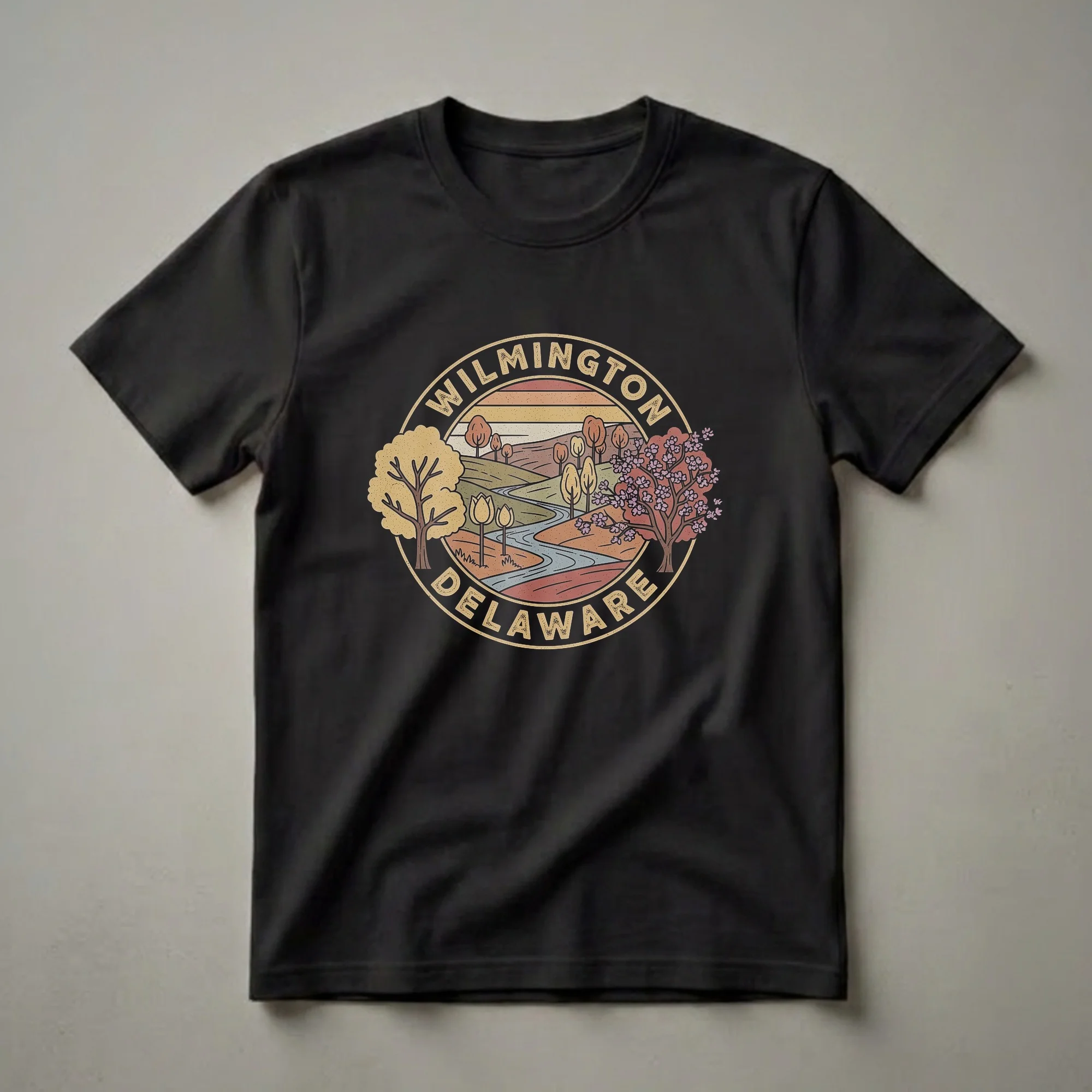 Wilmington, Delaware, is celebrated in this retro-style graphic tee, capturing the essence of the city's scenic beauty. The circular design showcases a stylized landscape with rolling hills, a winding river, and a variety of trees, including one in full bloom with pink blossoms and another with golden autumn leaves. The scene is set against a backdrop of a sunset with horizontal stripes of orange, yellow, and brown, evoking a nostalgic feel. The words "WILMINGTON DELAWARE" are emblazoned in a bold, distressed font around the perimeter of the circle. This shirt is a thoughtful gift for anyone who calls Wilmington home or has fond memories of visiting the city. It's a great way for Delaware residents to express their local pride, whether they are wearing it to a casual outing, a local event, or simply around town. The design's vintage aesthetic makes it a unique addition to any wardrobe, appealing to those who appreciate art and their hometown. This tee works well for anyone looking to showcase their connection to Wilmington, Delaware, a city known for its rich history and picturesque surroundings.