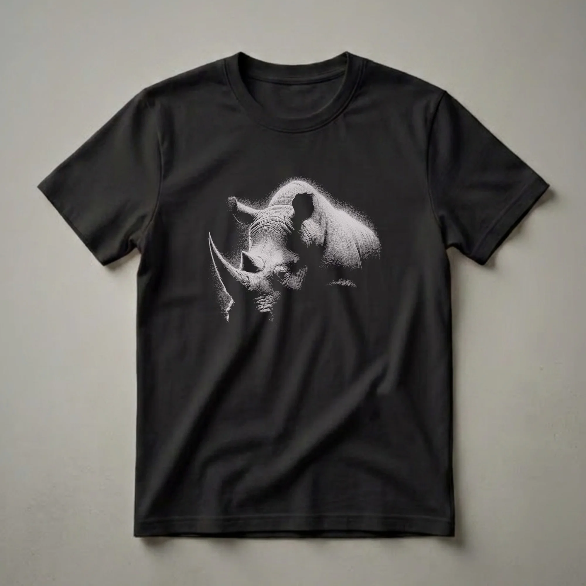 Wildlife enthusiasts and admirers of powerful mammals will appreciate this striking graphic tee featuring a detailed drawing of a rhinoceros head. The artwork is rendered in a vintage style, with high contrast and a stippled texture that brings out the ruggedness of the rhino's skin and its iconic horn. Rhinoceroses, often called rhinos, are large, herbivorous mammals native to Africa and Asia, known for their thick, protective skin and one or two prominent horns. These animals are critically endangered due to poaching and habitat loss, making awareness and appreciation for them more important than ever. This shirt is a thoughtful gift for any nature lover, hiker, or someone who is drawn to the raw beauty of the wild. Wear this unique t-shirt to your next outdoor adventure or casual outing to spark conversations about conservation and the natural world. It's a staple in the collection for anyone who respects these majestic creatures.
