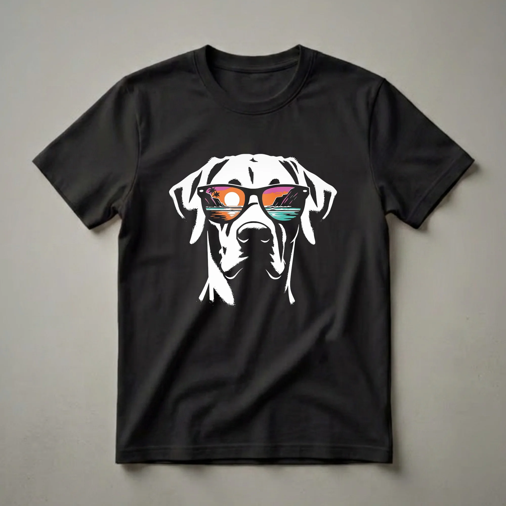 Rhodesian Ridgeback owners who appreciate a touch of retro cool will reach for this striking graphic tee. The design features a stylized white dog, possibly a Rhodesian Ridgeback known for its athletic build and distinctive ridge of hair, sporting a pair of sunglasses. These aren't just any shades; they reflect a vibrant tropical sunset scene complete with palm trees, a serene ocean, and distant mountains. This visual evokes a sense of vacation and relaxation, a perfect escape for any dog lover. The Rhodesian Ridgeback breed, originally from Southern Africa, was developed to track and bay lions, showcasing their courage and stamina. This shirt makes a thoughtful gift for any Rhodesian Ridgeback mom or dad who dreams of beach getaways or simply enjoys unique dog-themed apparel. Wear this eye-catching t-shirt to casual outings, dog park visits, or while enjoying a summer evening, and let your canine companion's cool style shine through.