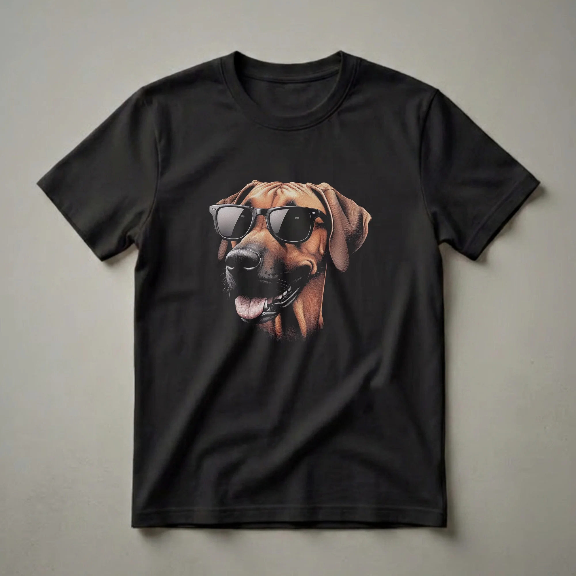 Show off your cool canine style with this artistic drawing of a Rhodesian Ridgeback sporting a pair of slick sunglasses. This striking graphic tee features a detailed drawing of a Rhodesian Ridgeback sporting classic black sunglasses, its tongue playfully peeking out. The artwork is rendered in a vintage style, with fine lines creating texture on the dog's fur and the sunglasses' frames. The Rhodesian Ridgeback, originally bred in Southern Africa for hunting lions, is known for its athleticism and courage. This shirt is a fantastic way for any Rhodesian Ridgeback mom or dad to express their affection for their canine companion. It makes a thoughtful gift for birthdays or holidays for the dog lover in your life who appreciates unique animal art. Wear this eye-catching t-shirt to dog parks, casual outings, or while relaxing at home with your furry friend. It’s a staple in the collection for anyone who cherishes their Ridgeback and wants to showcase their unique style.