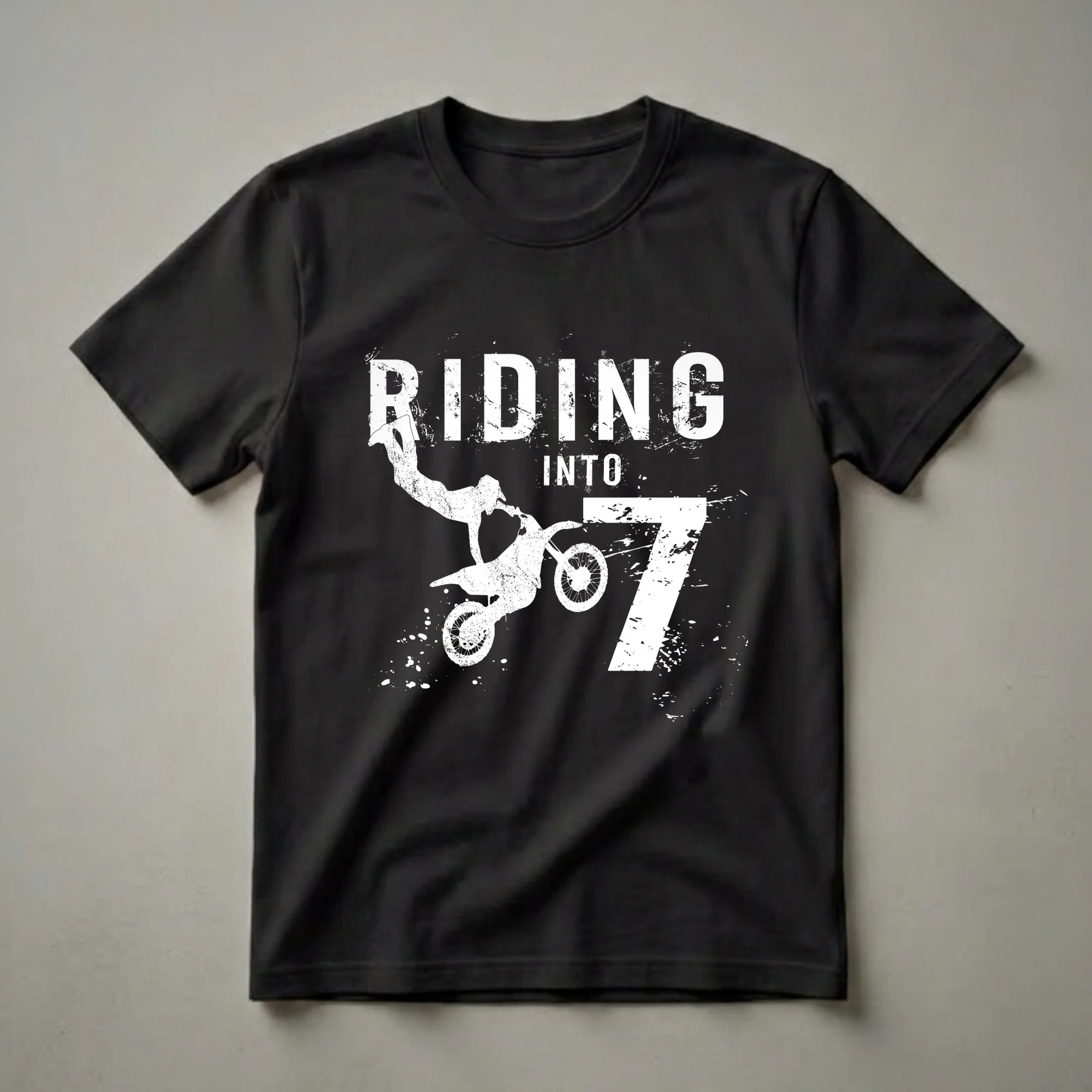 Seven-year-old boys who dream of hitting the track will love this "Riding Into 7" dirt bike t-shirt. The graphic features a dynamic white silhouette of a motocross rider mid-air, performing a jump. Bold, distressed white lettering spells out "RIDING INTO 7," with the large number 7 prominently displayed, signifying the birthday milestone. This tee is suited for young adventurers who are passionate about motocross and turning seven years old. Motocross racing is a thrilling sport that requires skill, balance, and courage, much like navigating the exciting years of childhood. This shirt makes a thoughtful gift for any boy celebrating his seventh birthday, whether he's a seasoned rider or just starting to explore the world of dirt bikes. It's a fantastic way to celebrate his special day and his love for the sport. He will reach for this shirt to wear to his birthday party, to the park, or just for everyday fun, showcasing his excitement for turning seven and his passion for motocross.