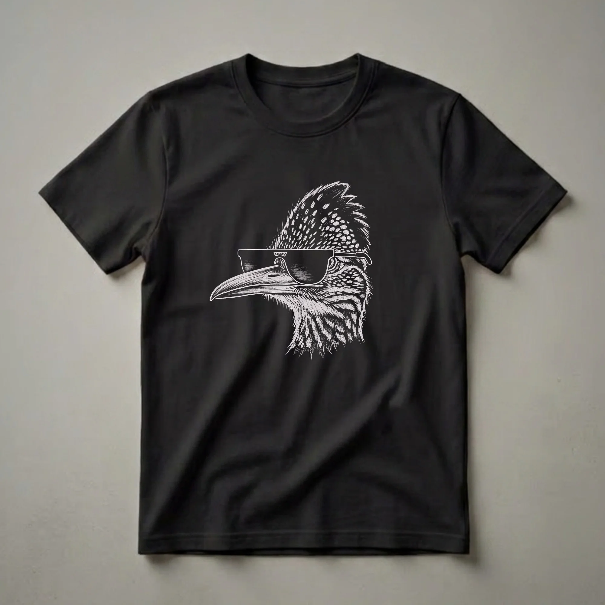 - A striking graphic t-shirt showcasing a detailed sketch of a roadrunner in cool sunglasses.