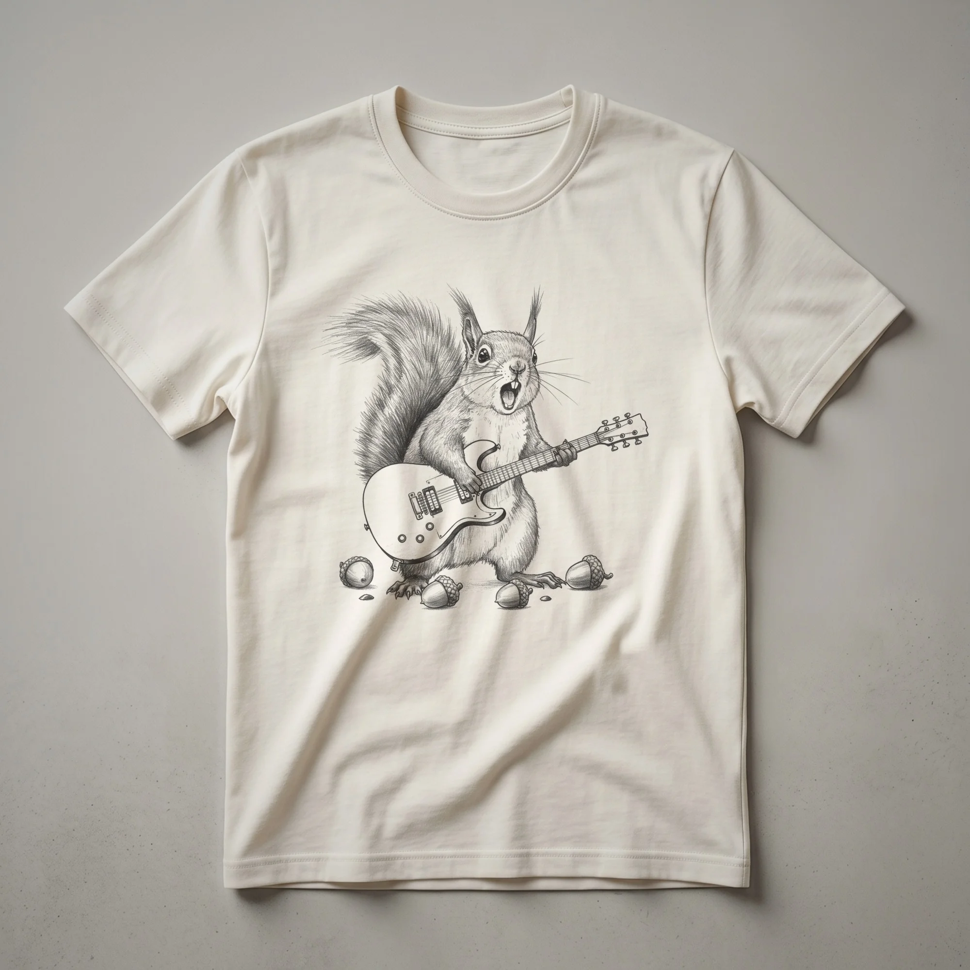 Squirrels, known for their agility and energetic nature, are often seen gathering acorns, their primary food source. This striking graphic tee captures a different side of these busy rodents, depicting one in a dynamic pose, passionately playing an electric guitar. The detailed line art style brings the scene to life, showcasing the squirrel with its mouth open in a rockstar-like expression, fully immersed in its musical performance. Surrounding the figure are several acorns, adding a touch of woodland charm to the design. This t-shirt is a fantastic way for guitarists, bass players, and music lovers to express their passion. It makes a thoughtful gift for any musician who appreciates a bit of quirky humor and unique artwork. Whether you're heading to band practice, a jam session, or just out and about, this shirt is sure to turn heads and spark conversations. It’s a go-to tee for anyone who loves both music and the playful spirit of squirrels.