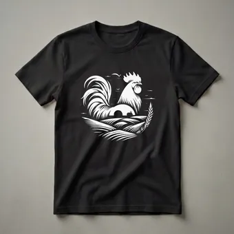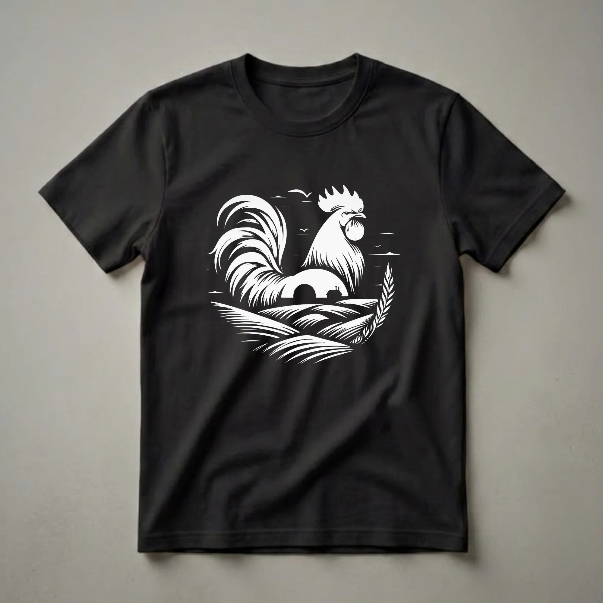 - This rooster graphic tee celebrates rural charm with a proud farm animal and scenic landscape.