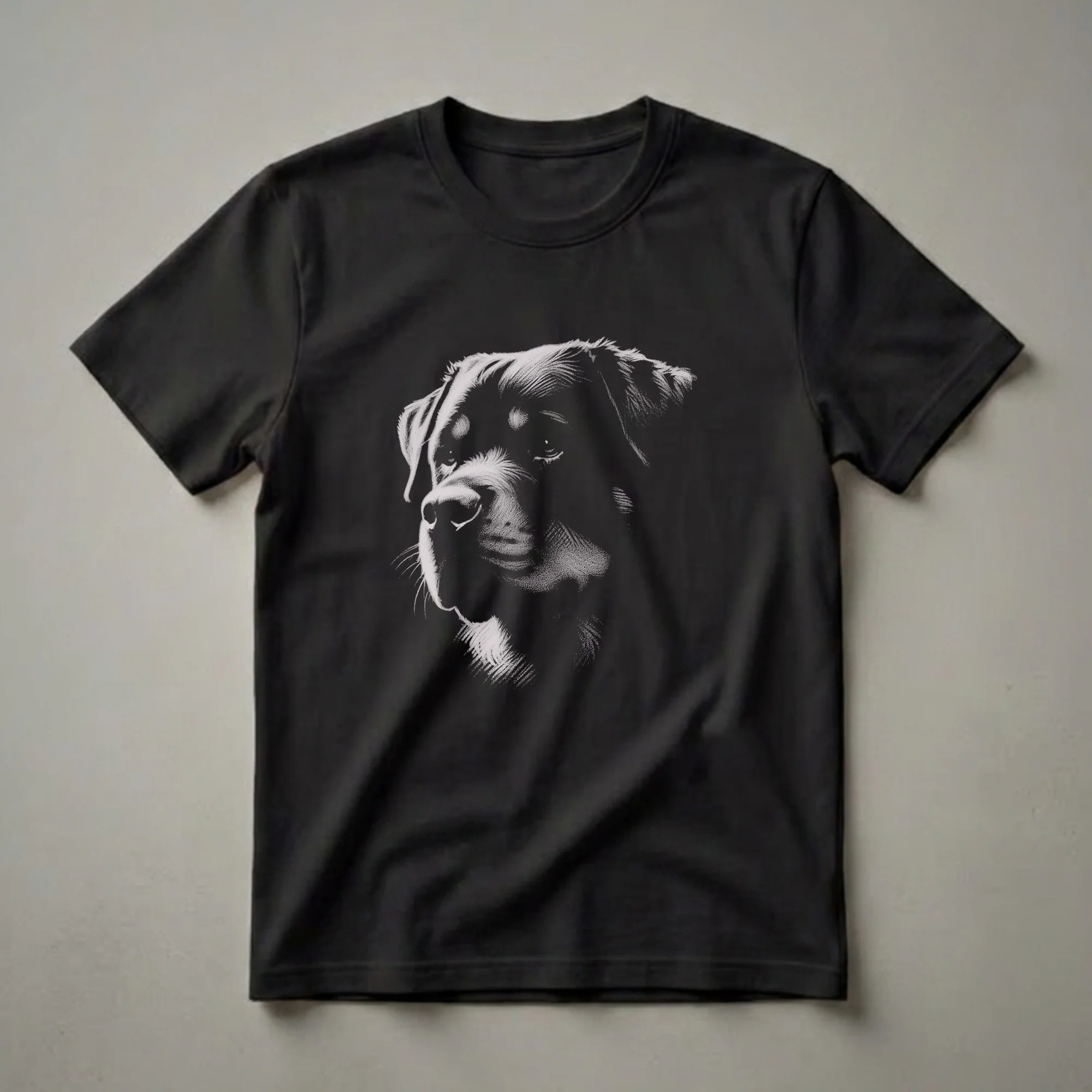 Rottweiler owners who appreciate the breed's powerful presence and loyal nature will reach for this unique graphic tee. The design features a detailed stippling drawing of a Rottweiler's head, rendered in white against a stark black background. This artistic approach highlights the dog's strong features, from its broad muzzle and expressive eyes to the texture of its fur, creating an eye-catching visual. Rottweilers, originally from Germany, were historically used as cattle drovers and guard dogs, known for their confidence and calm demeanor. This shirt is a thoughtful gift for the Rottweiler mom or dad who wants to display their affection for their canine companion. It's a staple in the collection for anyone who admires this noble breed. Wear this t-shirt to dog parks, casual outings, or while relaxing at home, letting your passion for Rottweilers be known. This apparel is a fantastic way to express your connection to these intelligent and devoted animals.