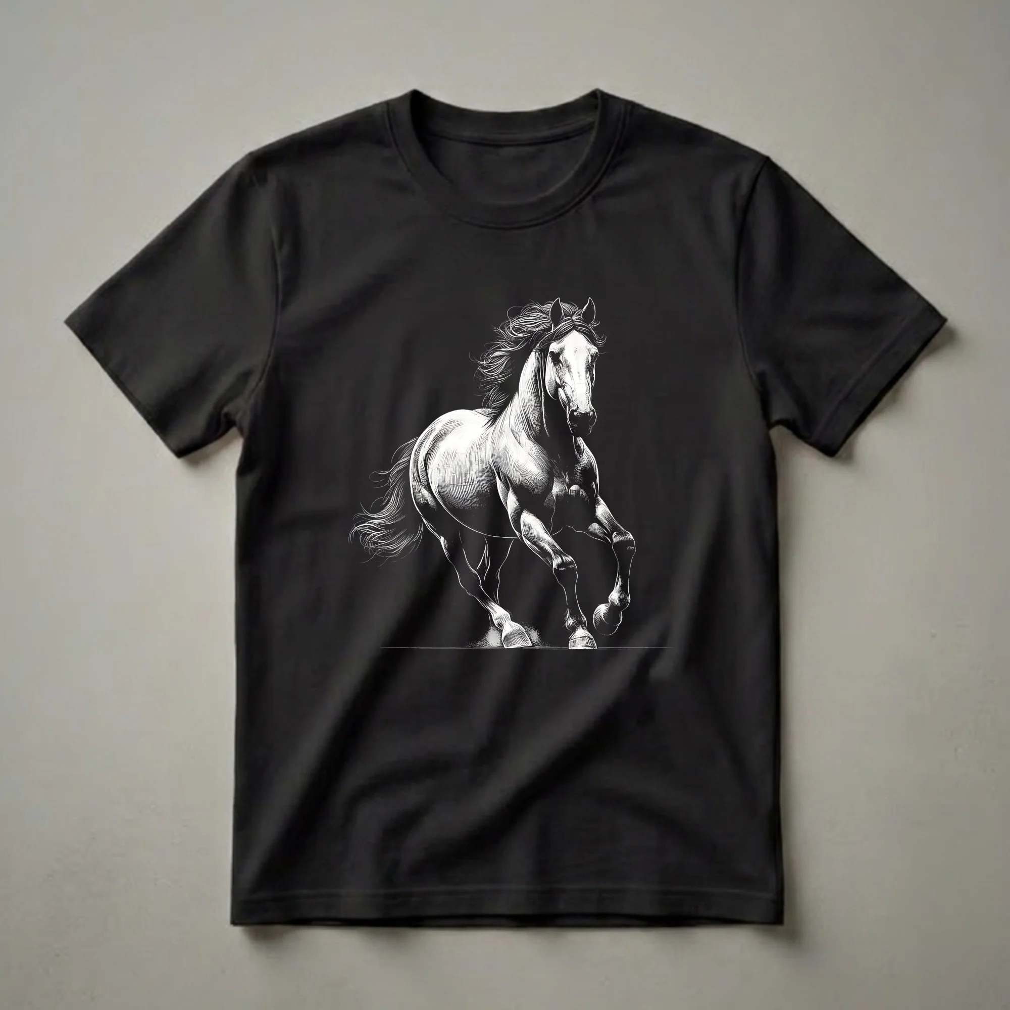 Runners and horse enthusiasts will appreciate the dynamic energy captured in this graphic tee. The artwork features a magnificent white horse in full stride, its musculature detailed with fine linework against a stark black background. The horse's mane and tail flow dynamically, conveying a sense of speed and freedom, much like a runner pushing through the final miles of a marathon. Horses, known for their incredible stamina and powerful build, are often seen as symbols of endurance and strength, qualities that resonate deeply with those who participate in long-distance running or other endurance sports. This shirt is a thoughtful gift for the marathoner in your life, the equestrian who spends hours training, or anyone who finds inspiration in the raw power and grace of these animals. Wear this t-shirt to your next training run, to a local race, or simply as a statement piece that celebrates your love for both the open road and the spirit of the horse. It's a staple in the collection for anyone who understands the dedication required to push their limits.
