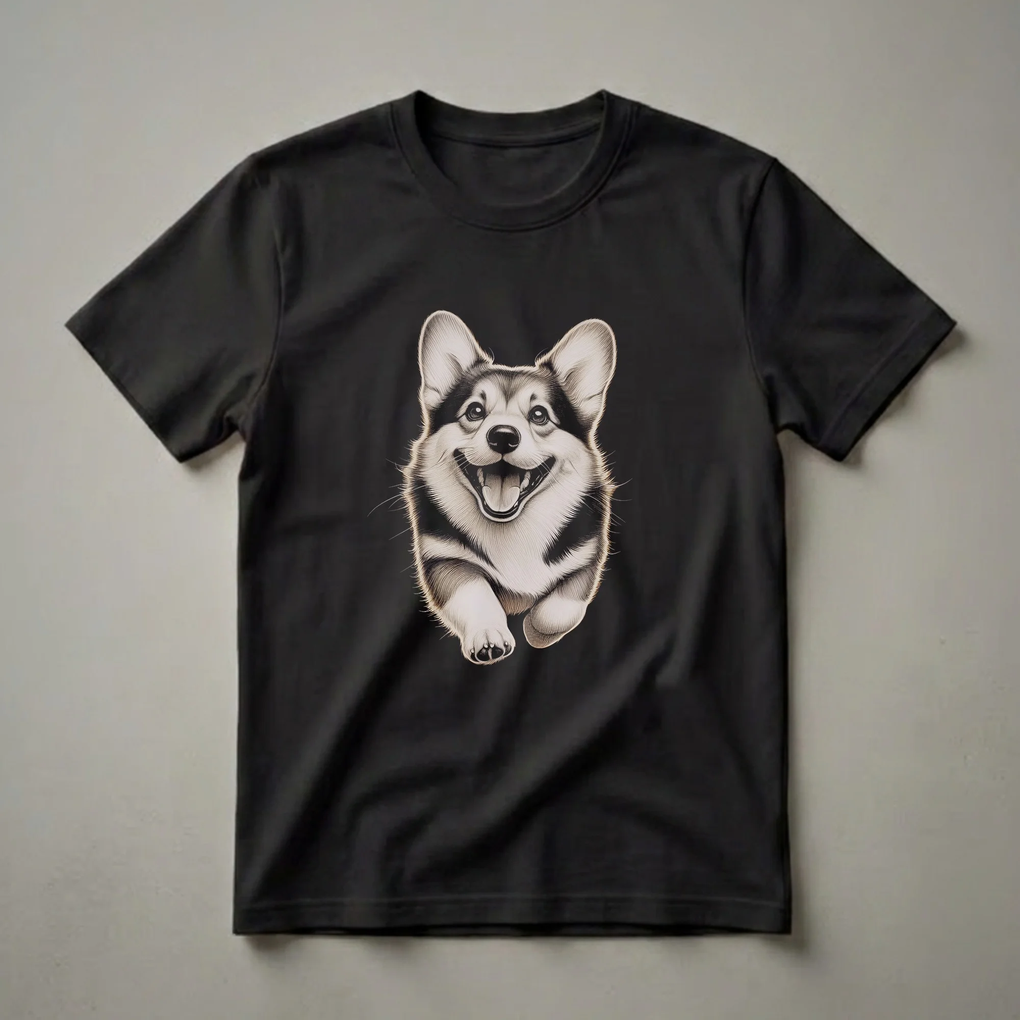 Pembroke Welsh Corgis are known for their boundless energy and playful spirit, traits perfectly captured in this eye-catching running dog tee. This shirt features a detailed, monochromatic drawing of a Pembroke Welsh Corgi in full stride, its tongue out and ears perked, conveying pure joy and athleticism. The art style, reminiscent of classic pen-and-ink illustrations, highlights the breed's distinctive features with fine lines and shading, making the corgi appear almost three-dimensional against the stark black background. These dogs, originally bred for herding cattle in Wales, possess surprising stamina and agility despite their short legs. This graphic t-shirt is a wonderful way for any Pembroke Welsh Corgi owner, often referred to as a 'Corgi mom' or 'Corgi dad,' to express their affection for their furry friend. It makes a thoughtful gift for birthdays, holidays, or just because for the dog lover in your life. Wear this unique corgi shirt to your next dog park visit, a casual outing, or while enjoying a brisk walk, celebrating the active lifestyle shared with your beloved pet.