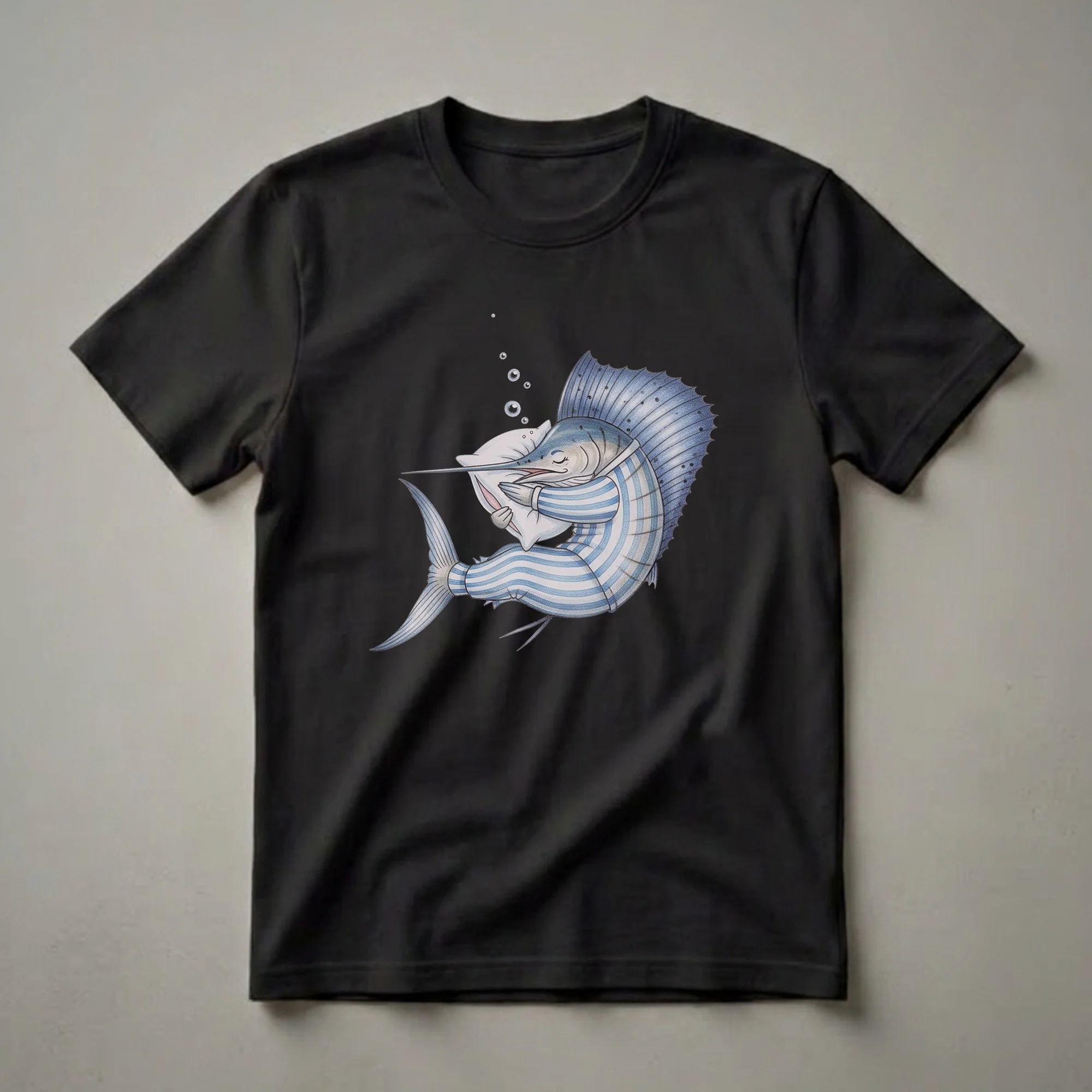 Sailfish, known for their incredible speed and distinctive dorsal fin, are depicted here in a charmingly whimsical scene. This graphic tee showcases a sailfish dressed in blue and white striped pajamas, sound asleep and clutching a pillow. Bubbles rise around the sleeping fish, adding to the serene and dreamlike quality of the artwork. Sailfish are pelagic predators found in tropical and warm-temperate seas worldwide, often migrating long distances. They are renowned for their ability to reach speeds of up to 68 miles per hour, making them one of the fastest fish in the ocean. This t-shirt is a thoughtful gift for marine life enthusiasts, anglers, or anyone who appreciates unique wildlife art. It's a comfortable and eye-catching shirt that brings a touch of playful fantasy to the world of ocean creatures. Wear this tee to casual outings, fishing trips, or simply when you want to showcase your love for the sea and its magnificent inhabitants.