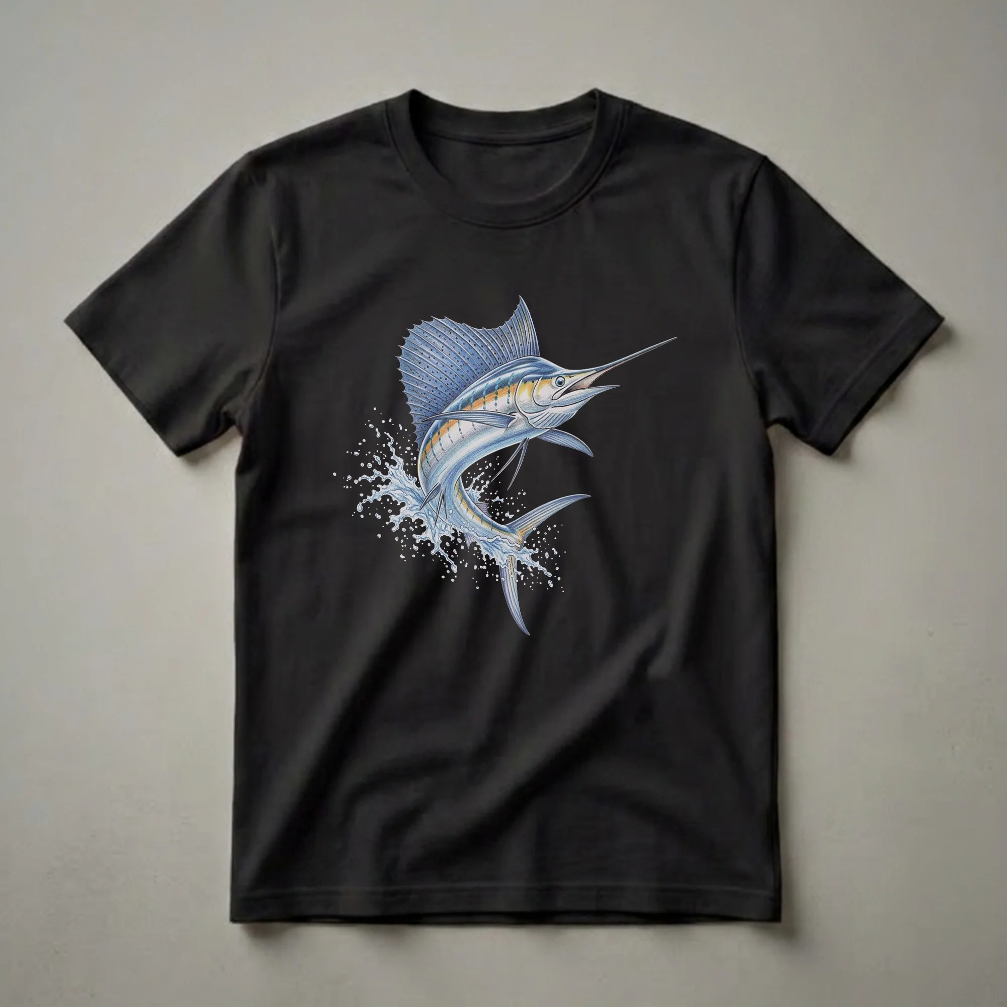 - Sport this detailed sailfish leaping graphic tee for vibrant ocean-themed style.