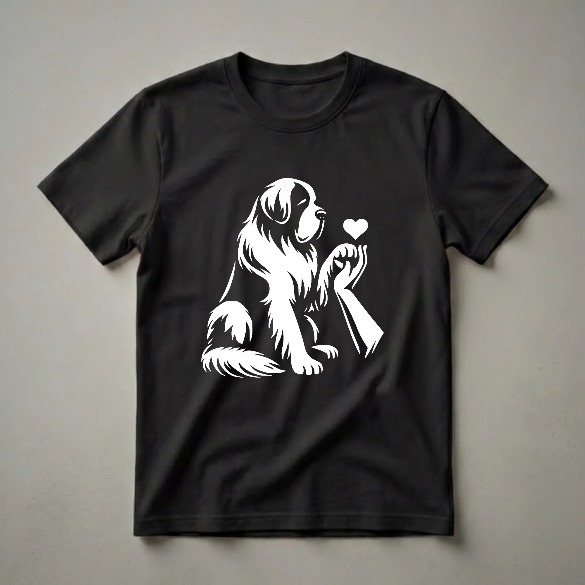 Saint Bernard owners who cherish their gentle giants will appreciate this striking graphic tee. The design features a stylized white Saint Bernard dog, known for its calm demeanor and impressive size, sitting attentively. A human hand is depicted offering a heart, symbolizing the deep bond between people and these magnificent animals. Saint Bernards, originally bred in the Swiss Alps for rescue work, are renowned for their friendly nature and loyalty, making them beloved companions. This shirt is a wonderful way for any Saint Bernard mom or dad to express their affection for their furry family member. It's a go-to tee for casual outings, dog park visits, or simply relaxing at home. This graphic t-shirt makes a thoughtful gift for the Saint Bernard enthusiast in your life, celebrating the unique connection they share with their dog. Wear it to show off your pride in owning one of the most iconic and loving dog breeds.