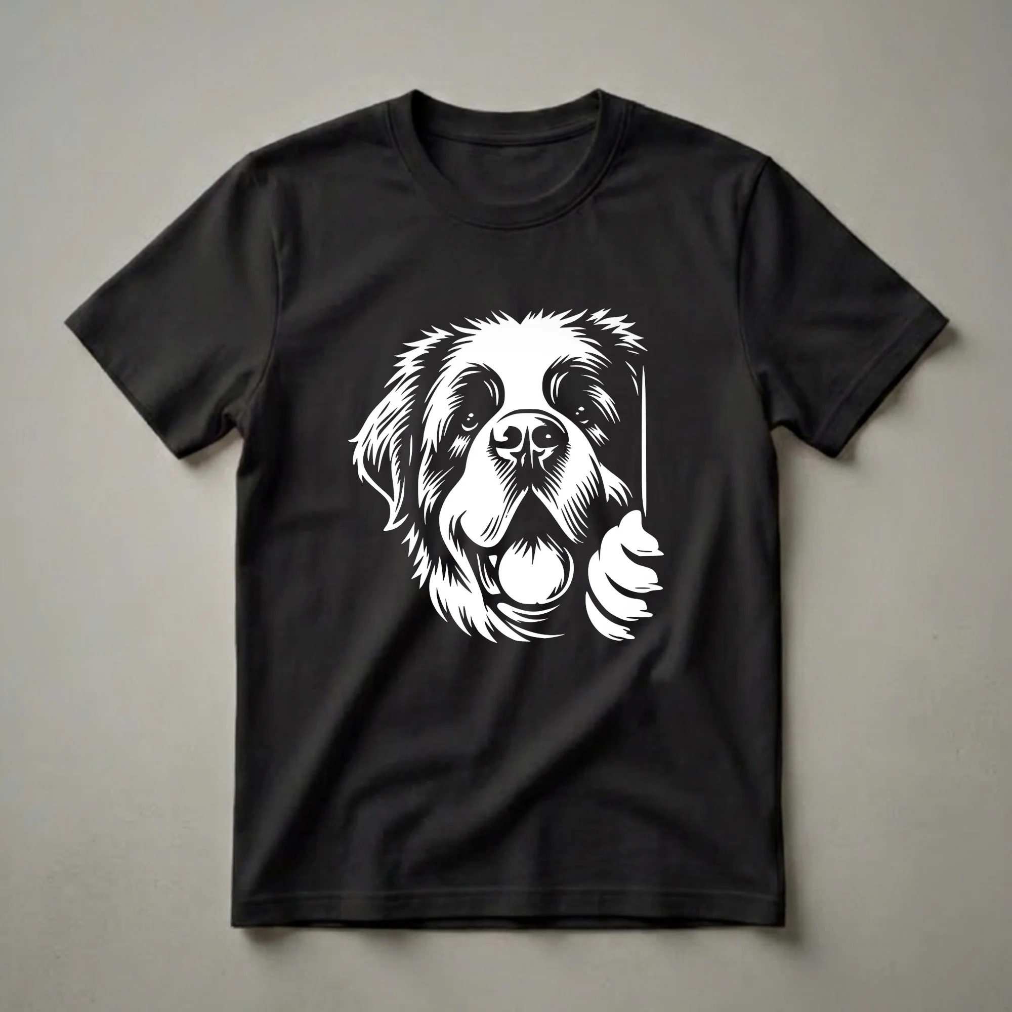 Saint Bernard owners who appreciate their gentle giants will reach for this unique graphic tee. The striking white design features the friendly face of a Saint Bernard peeking from the side, its large paw subtly visible. Known for their calm demeanor and impressive size, Saint Bernards were originally bred in the Swiss Alps as rescue dogs, famously saving travelers from snowstorms. This shirt captures the breed's endearing nature, making it a standout piece for any dog enthusiast. It's a thoughtful gift for the Saint Bernard mom or dad who cherishes their loyal companion. Wear this t-shirt to casual outings, dog park visits, or simply while relaxing at home with your furry friend. This comfortable tee is a staple for anyone who loves these magnificent dogs and wants to share that affection with the world. The graphic style is bold and instantly recognizable, well suited for sparking conversations with fellow dog lovers.