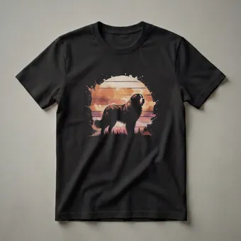 Saint Bernard owners who appreciate the breed's gentle giant nature will reach for this striking graphic tee. The design features a silhouette of a majestic Saint Bernard standing against a vibrant sunset, rendered in a vintage, artistic style. Splattered paint and distressed textures add to the unique, eye-catching aesthetic. This t-shirt is a wonderful way for any Saint Bernard mom or dad to express their affection for their beloved canine companion. The Saint Bernard, originally from the Swiss Alps, was bred as a rescue dog, known for its calm temperament and incredible strength. This shirt captures the serene beauty of the breed against a backdrop reminiscent of its mountainous origins. It makes a thoughtful gift for birthdays, holidays, or just because for the Saint Bernard lover in your life. Wear this tee on casual outings, to dog parks, or while relaxing at home, celebrating the bond you share with your furry friend.