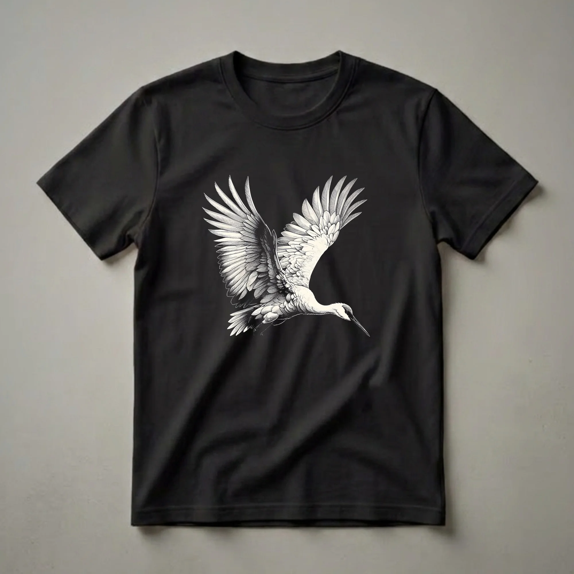 Birdwatchers and nature enthusiasts will appreciate the intricate detail of this Sandhill Crane graphic tee. The artwork depicts a majestic sandhill crane in mid-flight, its wings spread wide, showcasing the delicate feather patterns with a striking black and white illustration style. Sandhill cranes are known for their impressive wingspans, often reaching over six feet, and their distinctive trumpeting calls that echo across wetlands and prairies. These birds are migratory, traveling thousands of miles each year between their breeding grounds in the north and wintering areas further south, often congregating in large numbers in places like the Platte River in Nebraska. This shirt is a wonderful way for anyone who admires these magnificent birds to express their connection to the natural world. It makes a thoughtful gift for the birder in your life who enjoys observing wildlife in its natural habitat. Wear this unique t-shirt to your next birding expedition or casual outing to spark conversations about avian beauty.