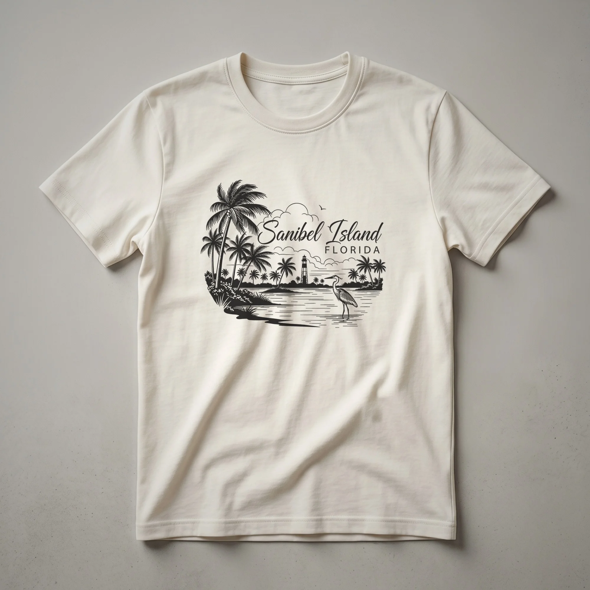 Sanibel Island, a barrier island off Florida's Gulf Coast, is renowned for its pristine beaches and abundant shelling opportunities. This striking graphic tee captures the serene beauty of the island with a detailed illustration. Dominating the scene is the iconic Sanibel Island Lighthouse, a historic landmark that has guided ships for over a century. Flanking the lighthouse are lush palm trees, evoking the tropical paradise that draws visitors from around the globe. In the foreground, a graceful heron stands in the shallow waters, a common sight in the island's rich ecosystem. The water itself is depicted with gentle ripples, suggesting a calm, tranquil environment. This t-shirt is a thoughtful gift for anyone who has visited Sanibel Island, cherishes its natural beauty, or dreams of a Florida getaway. It's a staple for beach lovers and travelers who want to carry a piece of the Sunshine State with them. Wear this shirt to remember your vacation or to inspire your next trip to the coast. This apparel serves as a wearable postcard, celebrating the unique charm of this beloved Florida destination.