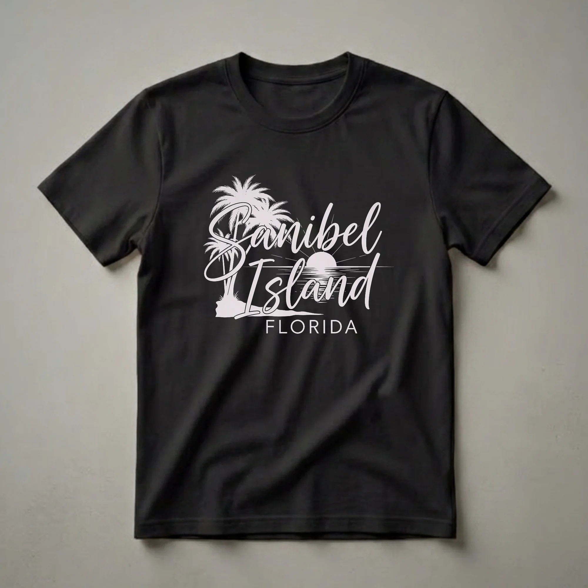Sanibel Island, a barrier island off the coast of Southwest Florida, is renowned for its shelling beaches and relaxed atmosphere. This graphic tee captures that tropical vibe with a stylized sunset over the water, framed by lush palm trees. The words 'Sanibel Island' are presented in an elegant script, with 'FLORIDA' in a bold, block font below. This shirt is a thoughtful gift for residents and visitors to commemorate their time on this beautiful Gulf Coast destination. Whether you're a snowbird, a vacationer, or simply a Florida enthusiast, this t-shirt serves as a wearable reminder of island life. It makes a thoughtful gift for anyone who cherishes memories of Sanibel's serene beaches and unique charm. Wear this tee to your next beach outing or casual gathering to share your appreciation for this special part of the Sunshine State.