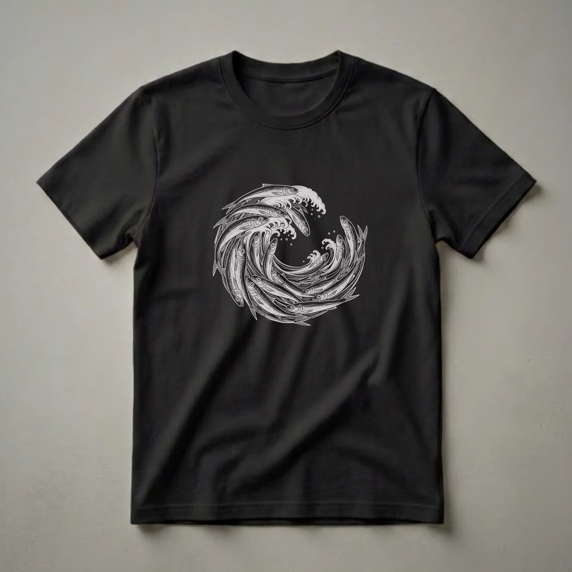 Ocean lovers can showcase their admiration for marine ecosystems with this artful t-shirt featuring a vintage sardine school wave drawing.The design showcases a school of sardines artfully arranged to form a dynamic wave, rendered in a detailed, vintage drawing style. This eye-catching artwork captures the essence of the sea and the fascinating behavior of schooling fish. Sardines are known for their incredible ability to move in unison, creating mesmerizing patterns in the water that can deter predators. This shirt celebrates that natural phenomenon, making it a thoughtful gift for anyone fascinated by marine biology, oceanography, or simply the vastness of the sea. Wear this t-shirt to your next coastal outing, a visit to an aquarium, or simply as a conversation starter that highlights your connection to the underwater world. It's a staple for any wardrobe that celebrates aquatic life and artistic expression. This apparel is a fantastic choice for beach trips or casual wear.