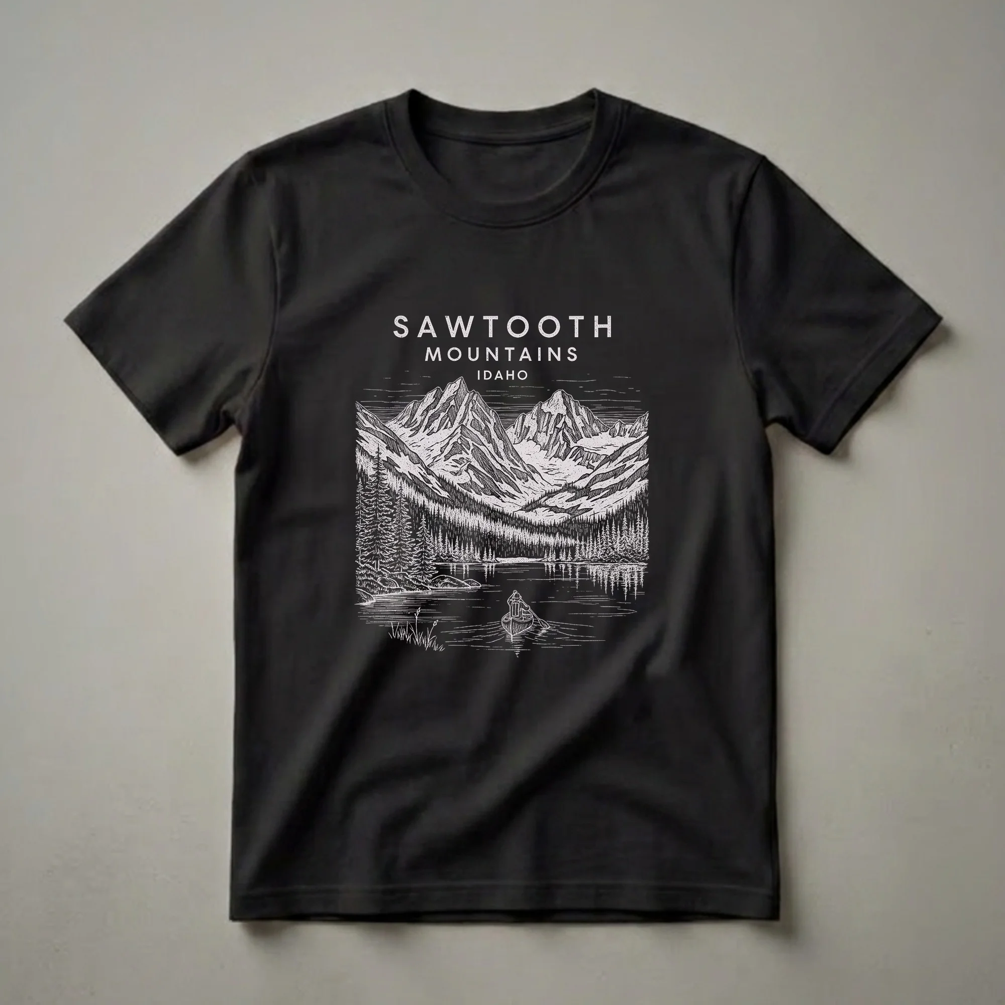 Idaho's Sawtooth Mountains offer a breathtaking landscape for any outdoor enthusiast. This vintage-style graphic tee captures the rugged beauty of the Sawtooth range, featuring a detailed line drawing of snow-capped peaks reflected in a serene lake. A lone canoeist paddles across the water, evoking a sense of peaceful exploration and connection with nature. The Sawtooth National Recreation Area is known for its pristine alpine lakes and challenging hiking trails, making it a prime destination for adventurers. This shirt is a thoughtful gift for anyone who has explored this stunning region or dreams of visiting. Wear this t-shirt on your next camping trip, hike, or casual outing to showcase your appreciation for the natural wonders of Idaho. It's a staple for any wardrobe celebrating the great outdoors.