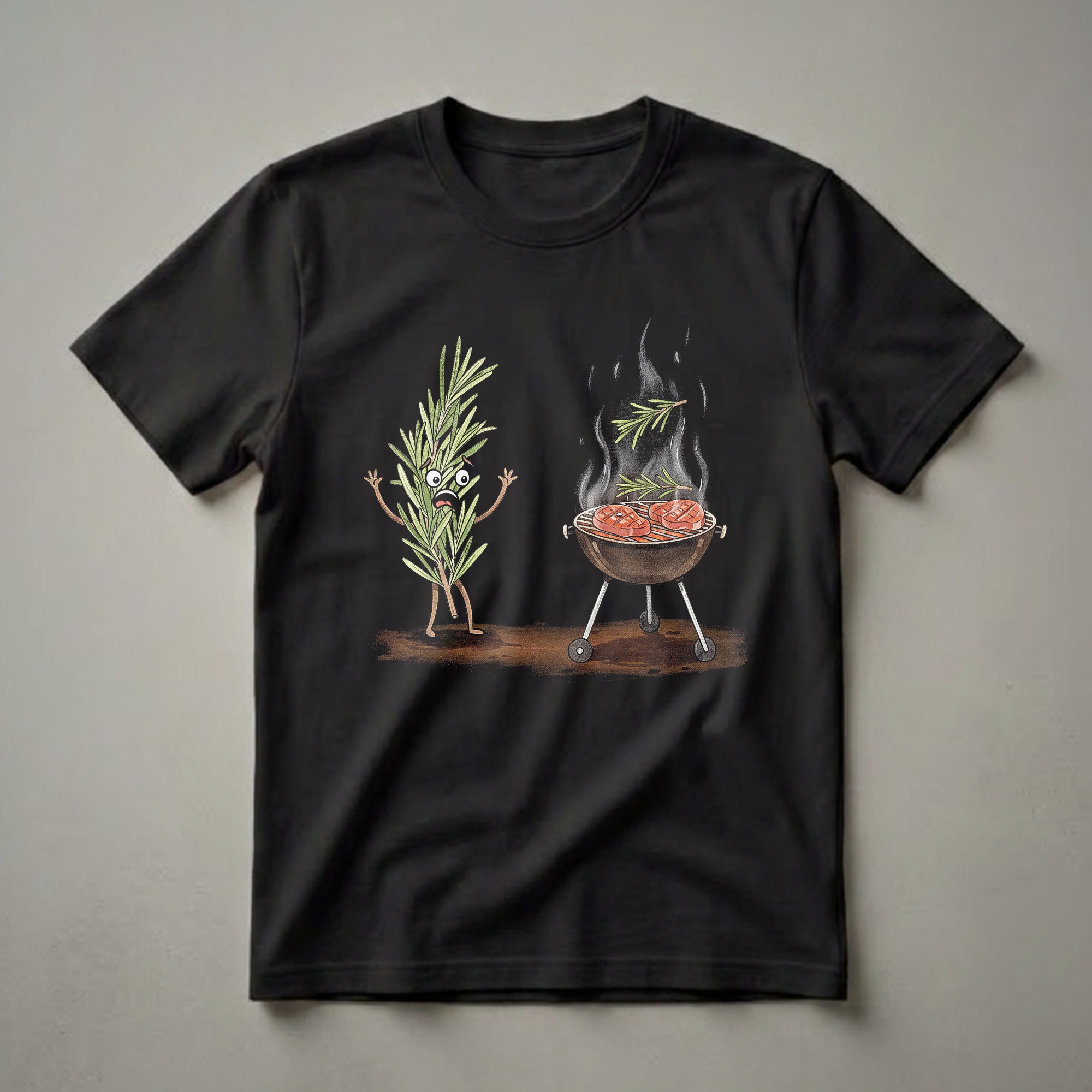 Rosemary sprigs, known for their aromatic contribution to roasted meats and vegetables, take center stage in this humorous graphic tee. The artwork depicts a single, anthropomorphic rosemary sprig with wide, panicked eyes and flailing arms, recoiling from a classic charcoal grill. On the grill, two juicy steaks sizzle, emitting plumes of smoke, with a lone rosemary sprig already placed on top, perhaps destined to flavor the meat. This playful design taps into the common culinary practice of using rosemary to enhance the flavor of grilled foods, presenting a comical scenario where the herb itself is aware of its fate. This t-shirt is a thoughtful gift for anyone who enjoys grilling, cooking, or has a quirky sense of humor about food. It’s a conversation starter, great to wear to a backyard barbecue, a casual get-together, or while preparing your favorite grilled dishes. The visual pun makes this shirt a go-to tee for chefs, food enthusiasts, and lovers of witty apparel. Embrace the fun side of the kitchen with this unique and eye-catching design that celebrates the relationship between herbs and the grill.