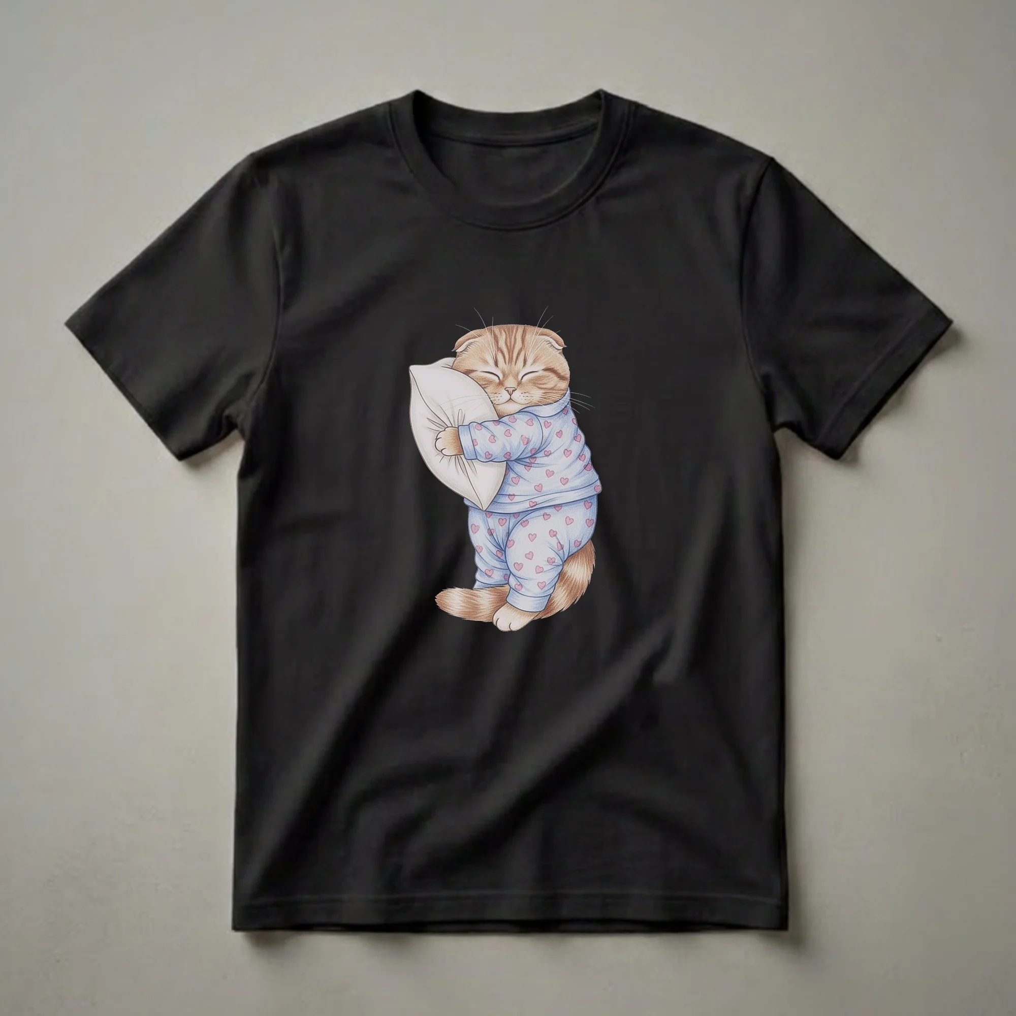 Scottish Fold cat owners know the breed's distinctive folded ears and gentle nature, often preferring a cozy nap to any other activity. This charming graphic tee captures that spirit with a delightful drawing of a Scottish Fold cat dressed in blue pajamas adorned with pink hearts. The cat is depicted with its eyes closed, peacefully hugging a fluffy pillow, embodying the ultimate comfort and relaxation. This t-shirt is a playful nod to the joy of a good night's sleep and the simple pleasures in life. It's a staple in the collection for anyone who appreciates feline charm and a touch of whimsy. This shirt works well for cat moms, cat dads, or anyone who finds joy in the quiet moments of their furry companions. Imagine gifting this to a friend who adores their Scottish Fold or simply loves cats in general; they will reach for this tee often. It’s a thoughtful gift for birthdays, holidays, or just because. Wear this comfortable tee to your next pajama party, a casual brunch, or while enjoying a lazy weekend morning at home with your own beloved pet.