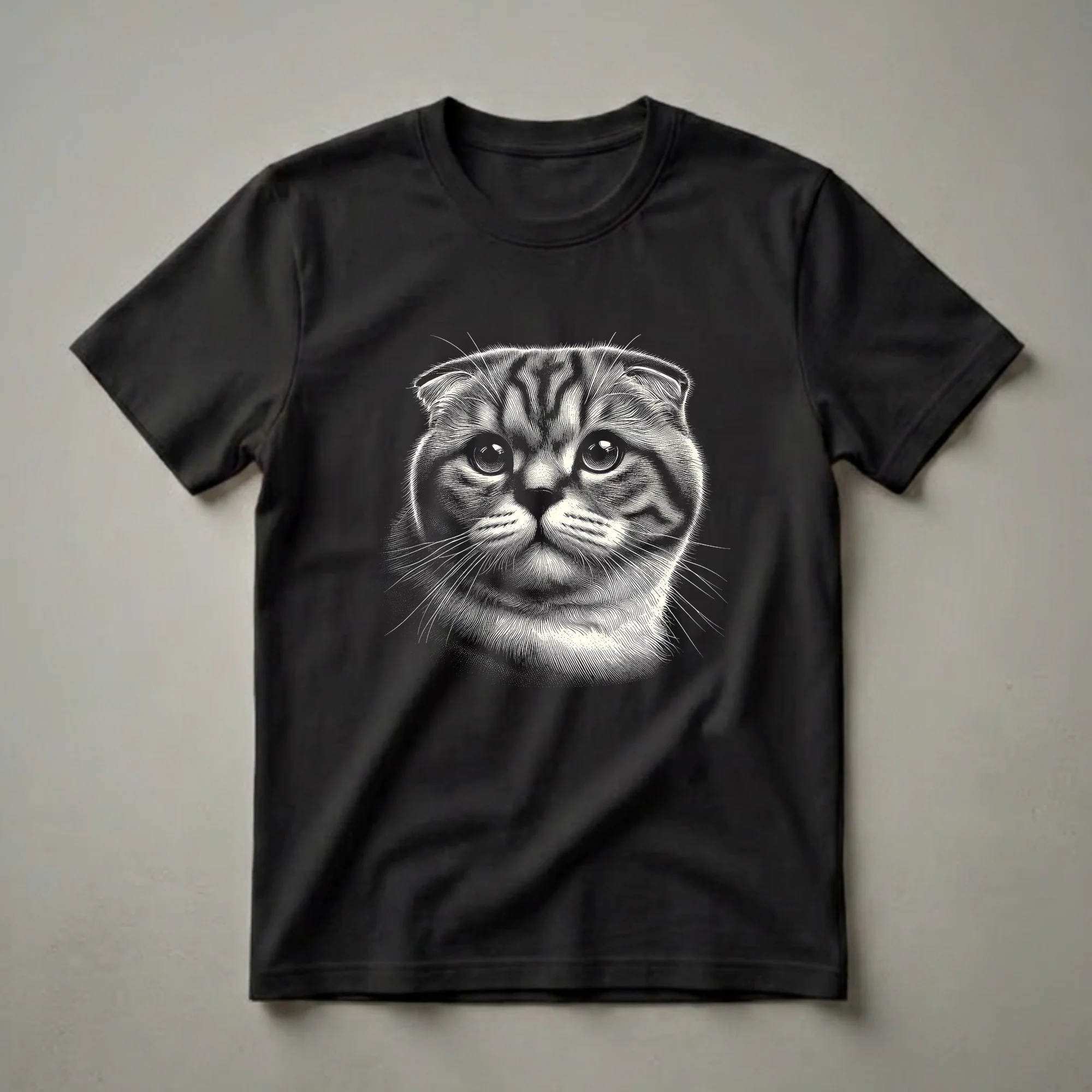 Cat moms and dads who appreciate unique feline art will reach for this striking Scottish Fold cat graphic tee. The design features a detailed, vintage-style illustration of a Scottish Fold cat's face, rendered with fine linework against a solid background. Scottish Folds are known for their distinctive folded ears and sweet, gentle nature, making them a beloved breed among cat enthusiasts. This t-shirt captures the breed's charm with an artistic flair. It's a thoughtful gift for anyone who adores cats, especially those with a soft spot for this particular breed. Wear this eye-catching shirt to casual outings, cat-themed events, or simply when you want to share your passion for your furry companions. This shirt is a staple for any cat lover's wardrobe, offering a blend of retro style and feline appreciation.