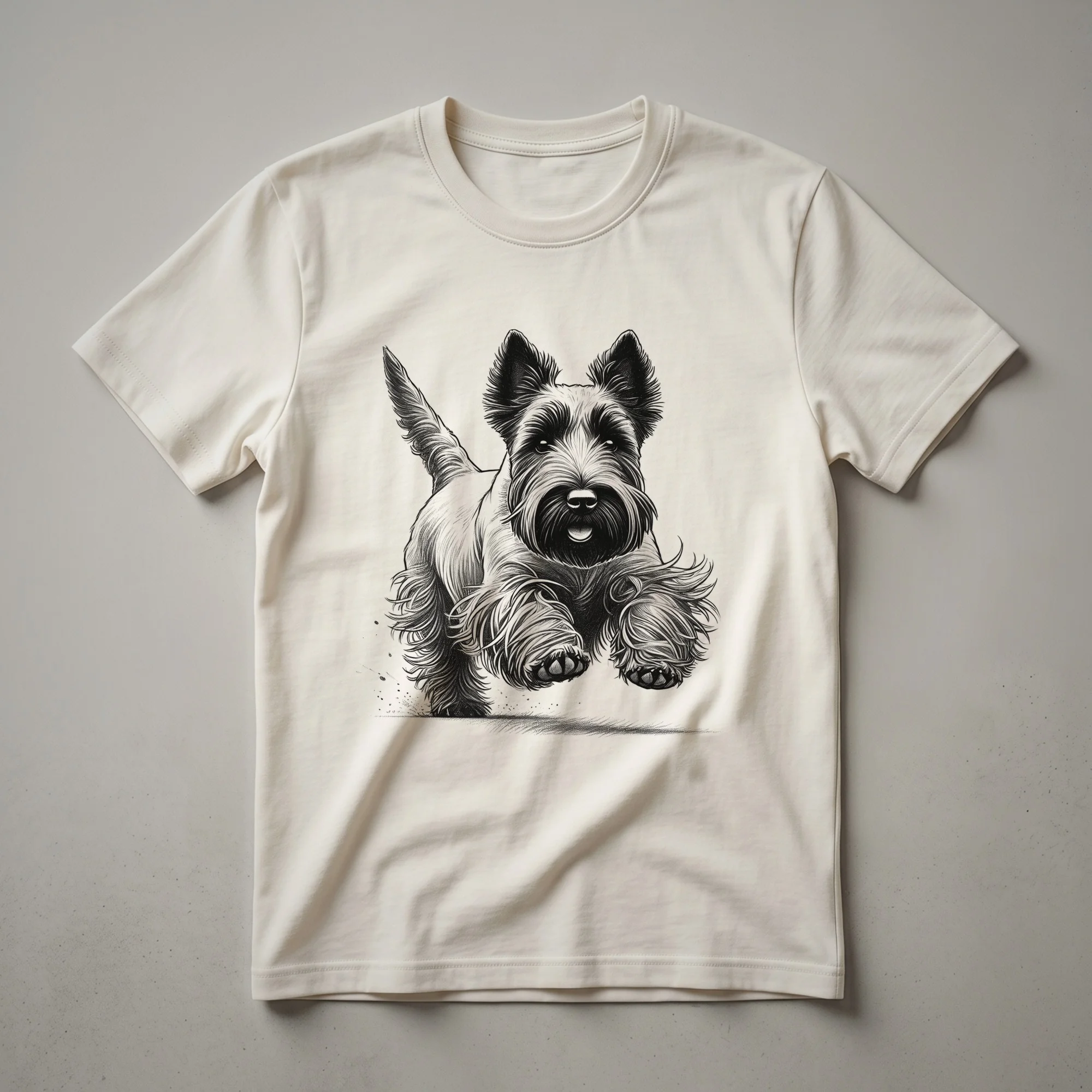 Scottish Terrier owners who appreciate their breed's spirited personality will reach for this graphic tee. The design features a Scottie in a dynamic running pose, rendered with a distressed texture that adds a vintage feel. Scottish Terriers, originally bred in Scotland for hunting vermin, are known for their feisty and independent nature, making them a unique companion for active individuals. This shirt is a fantastic way for Scottie moms and dads to express their passion for their furry friends. It works well for casual outings, post-run celebrations, or simply lounging at home. Consider this eye-catching t-shirt as a thoughtful gift for the Scottish Terrier enthusiast in your life who also enjoys running or an active lifestyle. It’s a staple in the collection for any Scottie lover who wants to wear their heart on their sleeve, or rather, on their chest. This tee is a great conversation starter at dog parks or running events.