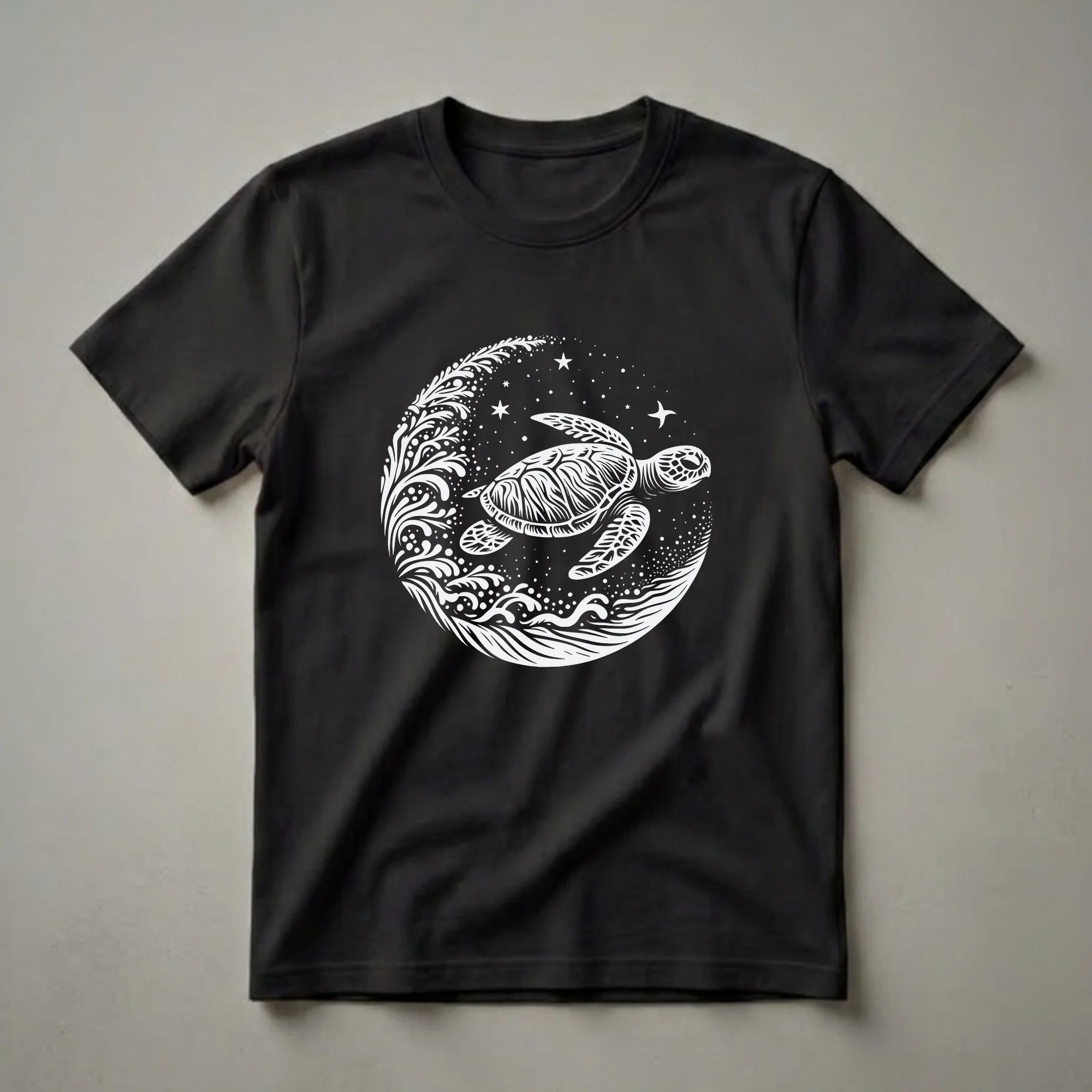 Ocean lovers and wildlife enthusiasts will reach for this unique sea turtle moon graphic tee. The design features a detailed linocut-style illustration of a sea turtle gracefully swimming through stylized waves and a starry night sky, all contained within a circular frame. This striking visual evokes the serene beauty of marine life under the moonlight. Sea turtles, such as the green sea turtle depicted, are ancient mariners that undertake incredible migrations across oceans, playing a vital role in maintaining the health of seagrass beds and coral reefs. This shirt is a thoughtful gift for anyone who cherishes the ocean's mysteries and the majestic creatures that inhabit it. Wear this t-shirt to the beach, on a nature walk, or simply as a conversation starter about marine conservation. It's a staple in the collection for those who feel a deep connection to the sea and its inhabitants, making it a go-to tee for casual outings and expressing a love for the underwater world.