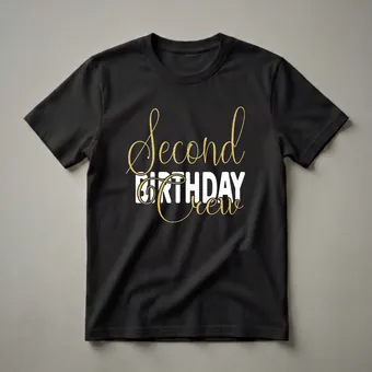 The 'Second Birthday Crew' graphic tee is a striking way for family members to coordinate for a special celebration. The design features the word "Second" in an elegant, shimmering gold script, immediately highlighting the milestone age. Below this, "BIRTHDAY" is presented in bold, clean white capital letters, providing a strong contrast. The word "Crew" is written in the same luxurious gold script as "Second," tying the design together and emphasizing the group aspect of the celebration. This t-shirt is a thoughtful gift for parents, siblings, grandparents, aunts, uncles, and cousins who want to show their support and join in the fun for a child turning two. Imagine the birthday photos with everyone sporting these matching shirts! This apparel is well suited for a birthday party, a family gathering, or even a casual outing to celebrate the little one's big day. The bold text and glittering gold accents make this shirt a festive and memorable addition to any birthday ensemble, ensuring the whole family feels connected and celebratory.