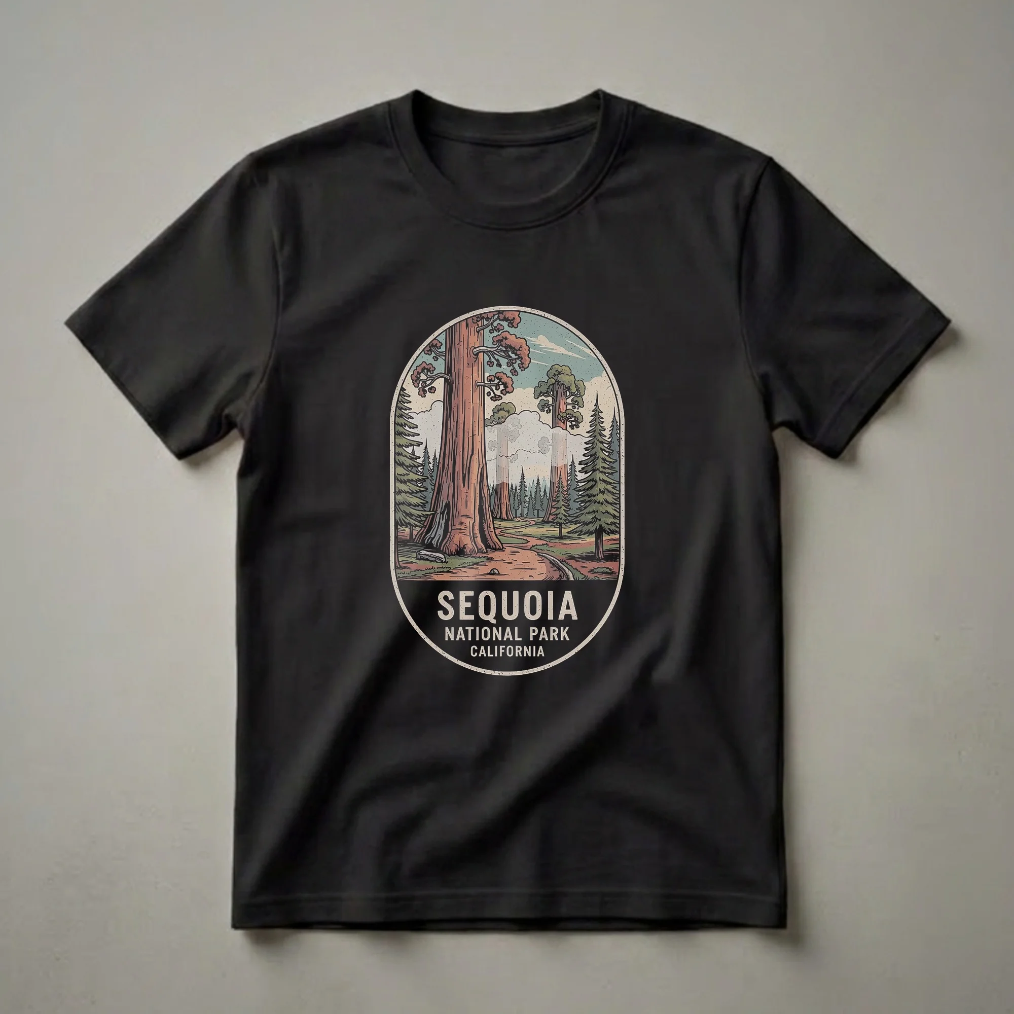 Sequoia National Park, located in California's southern Sierra Nevada mountains, is renowned for its giant sequoia trees, the largest trees on Earth by volume. This striking graphic tee captures the essence of the park with a vintage-style illustration depicting a serene forest scene. Dominating the foreground is the immense trunk of a giant sequoia, its textured bark rendered in warm, earthy tones. A winding path invites exploration through the dense woodland, leading the eye towards more towering trees and a sky filled with stylized clouds. The design evokes the feeling of a classic national park emblem, celebrating the natural wonder of this iconic California destination. This shirt is a thoughtful gift for hikers, campers, and anyone who cherishes the grandeur of the Sierra Nevada. Wear it on your next outdoor adventure or as a reminder of your visit to this breathtaking landscape. The shirt itself serves as a wearable piece of art, a thoughtful choice for outdoor enthusiasts who want to carry a piece of the park with them. It's a staple for anyone who appreciates the majesty of nature and the unique beauty of California's wilderness. This tee is a go-to for casual wear, outdoor excursions, or simply reminiscing about the towering giants.
