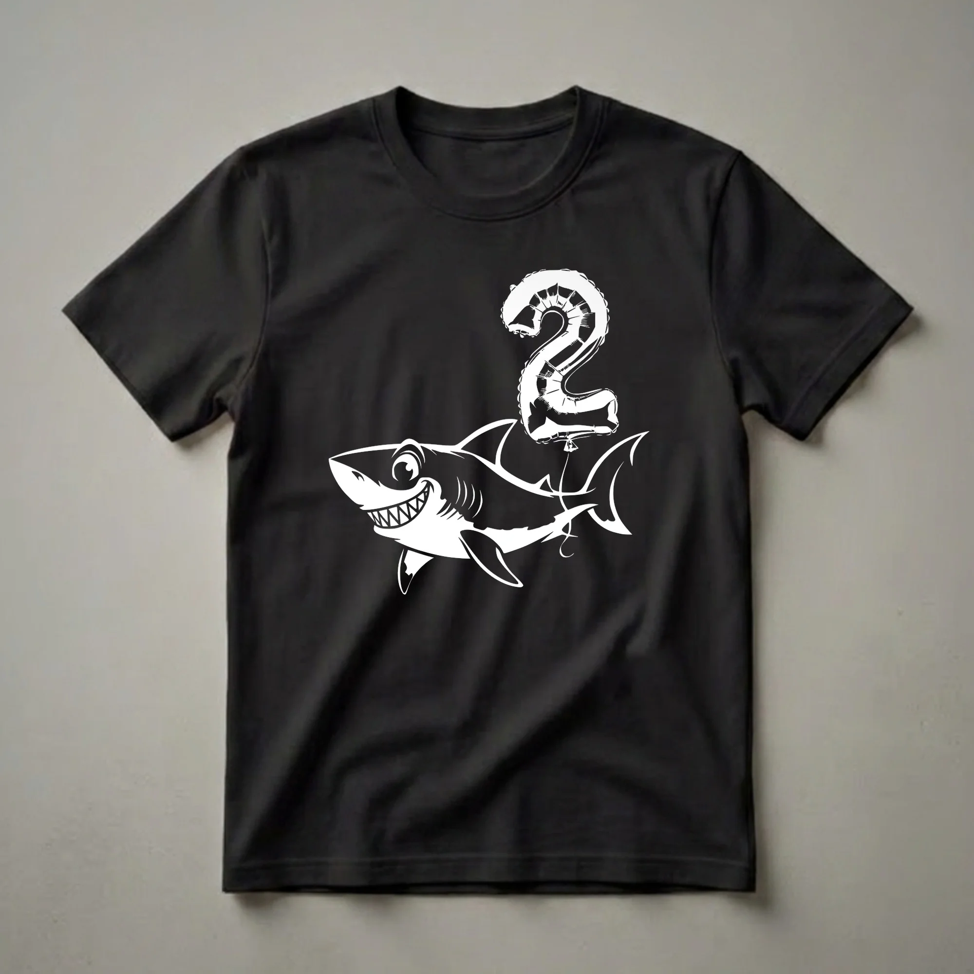 Two-year-olds are entering a phase of incredible discovery and joy, and what better way to celebrate their second birthday than with a roaring good time? This graphic tee features a friendly, cartoonish shark with a wide, toothy grin, complete with a shiny, inflated balloon shaped like the number '2' floating above its head. Sharks, while often depicted as fearsome predators, are fascinating creatures that play a vital role in marine ecosystems, with species like the great white shark being apex predators. This shirt is worn by any child turning two who loves marine life or simply enjoys a fun, eye-catching design. It makes a thoughtful gift for a toddler's birthday party, a special present from grandparents, aunts, or uncles looking to mark this special milestone. Imagine the birthday boy or girl wearing this t-shirt to their party, opening presents, or enjoying cake with friends and family. This shirt is a fun way for a two-year-old to express their personality on their big day, making it a memorable addition to their birthday celebration attire.