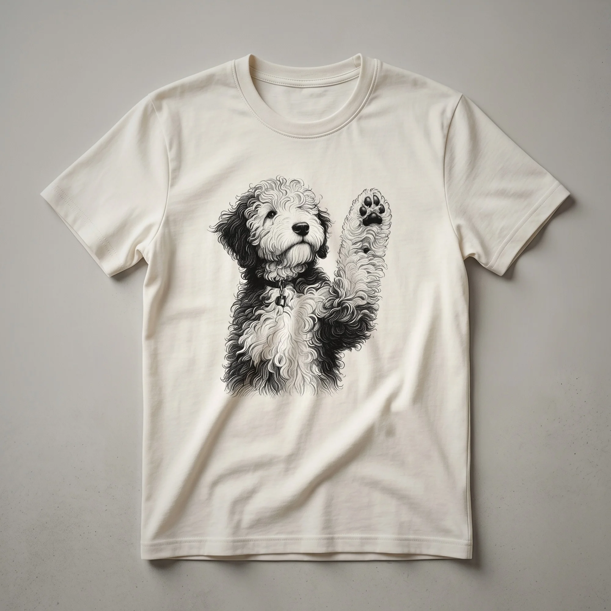 Sheepadoodle owners know the unique charm and playful spirit of these beloved dogs. This graphic tee features a delightful illustration of a Sheepadoodle, captured in the act of raising its paw, rendered in a clean, eye-catching line-art style. The design is a subtle yet clear nod to the breed's affectionate and engaging nature. Sheepadoodles, a cross between an Old English Sheepdog and a Poodle, are known for their intelligence, gentle disposition, and fluffy coats, making them a favorite among dog enthusiasts. This shirt is a wonderful way for any Sheepadoodle mom or dad to express their connection to their canine companion. It makes a thoughtful gift for birthdays, holidays, or just because for the Sheepadoodle lover in your life. Wear this comfortable t-shirt to your next dog park visit, a casual outing with friends, or simply while relaxing at home with your furry best friend. It's a staple piece for any dog enthusiast's wardrobe, celebrating the joy that Sheepadoodles bring into our lives.