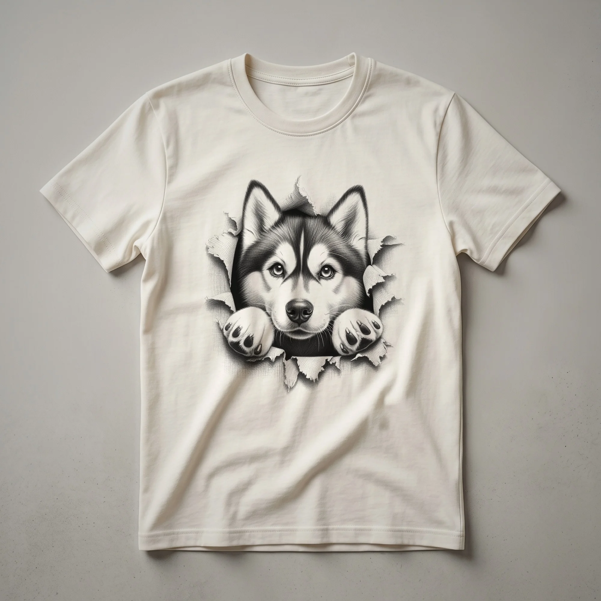 Siberian Husky moms who cherish their energetic and friendly companions will adore this eye-catching graphic tee. The design features the distinctive face of a Siberian Husky peeking out from behind a vibrant, artistic floral arrangement. This striking visual is set against a subtly distressed background, adding a touch of vintage charm to the overall aesthetic. Siberian Huskies, originally bred by the Chukchi people of northeastern Asia, are known for their endurance and striking blue or bi-colored eyes, traits that are captured in the spirit of this design. This t-shirt is more than just apparel; it's a statement piece for any dog owner who wants to display their affection for their husky. It makes a thoughtful gift for birthdays, holidays, or just because for the dog mom in your life. Wear this comfortable tee to casual outings, dog park visits, or while relaxing at home, letting everyone know about your special bond with your Siberian Husky. This shirt is a staple for any dog lover's wardrobe, offering a unique blend of canine charm and floral beauty.