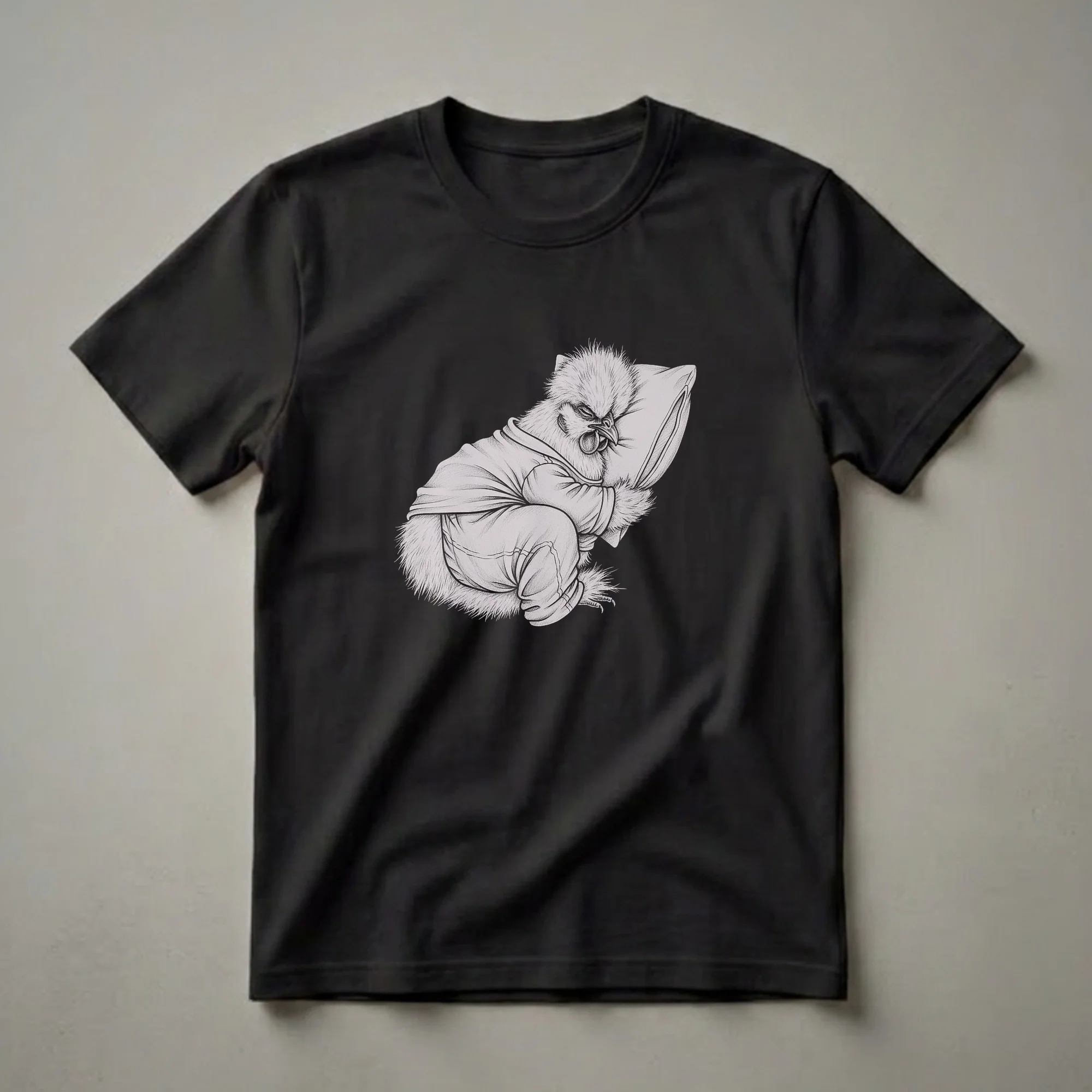 Silkie chickens, known for their fluffy, down-like feathers that resemble silk or fur, are depicted here in a humorous, slumbering pose. This eye-catching graphic tee showcases a Silkie chicken dressed in a cozy pajama set, complete with a top and pants, nestled against a plush pillow. The detailed drawing captures the unique texture of the Silkie's plumage and its sleepy expression, making it a standout piece for any poultry enthusiast. These charming birds are often kept as pets due to their docile nature and distinctive appearance, making them a beloved subject for art and apparel. This t-shirt is a thoughtful gift for anyone who adores these unique fowl or appreciates a good laugh. It's a comfortable and conversation-starting piece, a thoughtful choice for casual outings, game nights, or simply lounging around the house. Imagine wearing this to your next brunch or gathering, sure to bring smiles to fellow chicken lovers and those who appreciate a touch of whimsy in their wardrobe. This shirt celebrates the quiet moments of rest, even for our feathered friends.