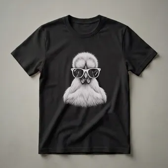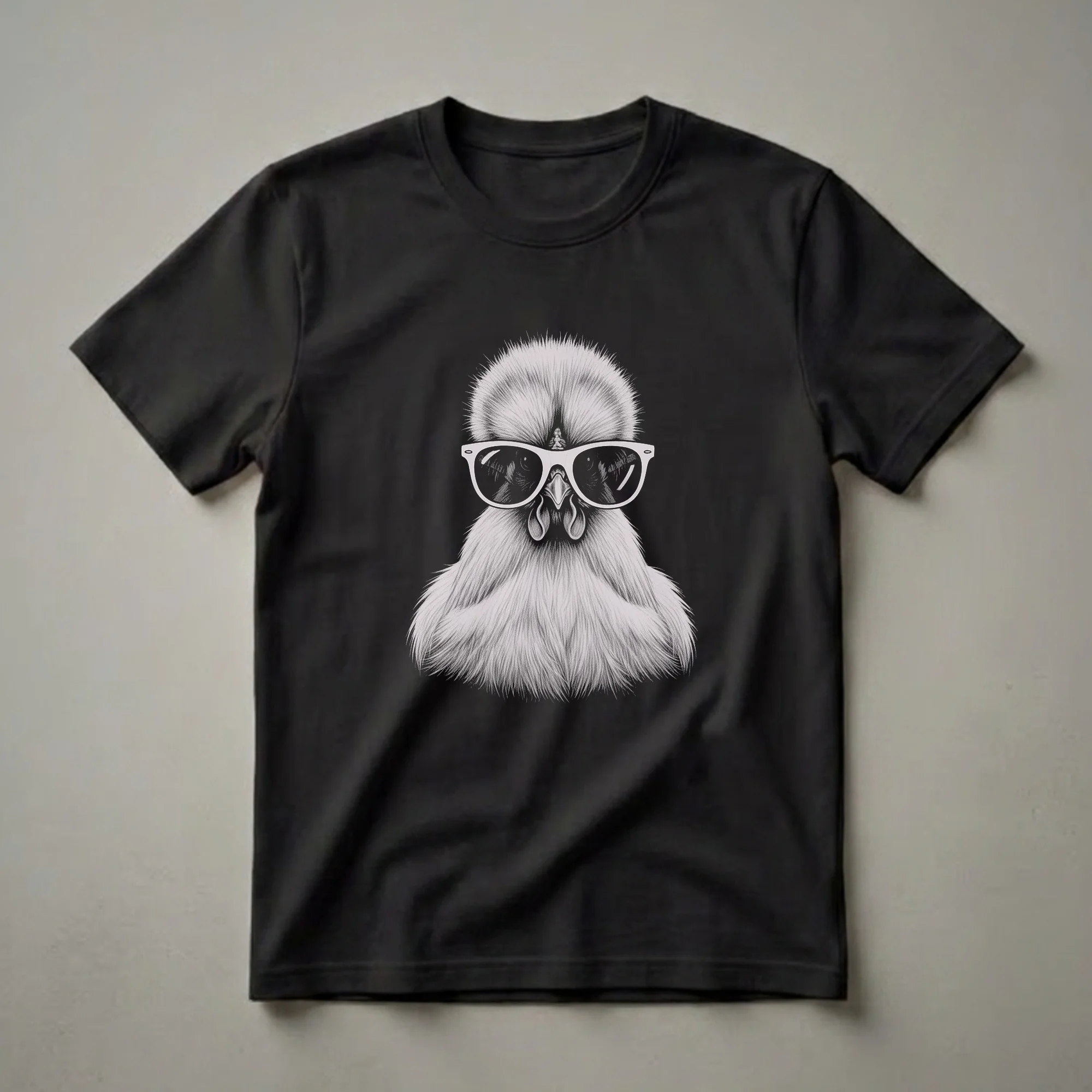 Silkie chickens, known for their fluffy, silk-like plumage and gentle demeanor, are brought to life in this striking graphic tee. This shirt features a detailed, vintage-style drawing of a Silkie chicken sporting a pair of cool sunglasses, set against a solid black background. The art style evokes a classic sketch, highlighting the unique texture of the Silkie's feathers and the playful attitude conveyed by the eyewear. Silkie chickens, originating from Asia, are a popular ornamental breed prized for their docile nature and distinctive appearance, often described as having a 'fluffy' or 'powder puff' look. This t-shirt is a fantastic way for any Silkie chicken owner, poultry enthusiast, or bird lover to express their passion. It makes a thoughtful gift for someone who appreciates unique animal art and has a soft spot for these charming birds. Wear this eye-catching tee to your next poultry show, a casual outing with fellow bird keepers, or simply around the house to showcase your unique style and love for these feathered friends. This shirt is a go-to for anyone who adores the distinctive charm of Silkie chickens.