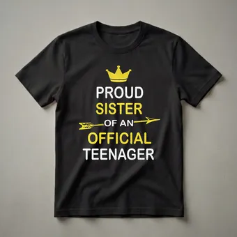 Thirteen is a milestone year, marking the official transition into the teenage years. This graphic t-shirt proudly declares 'Proud Sister of an Official Teenager,' complete with a regal yellow crown and a bold yellow arrow. The distressed white and yellow lettering stands out against the black background, making a clear statement for any sister whose sibling is hitting this significant age. This shirt is a thoughtful gift for a sister who is excited to celebrate her brother or sister officially becoming a teenager. It’s a fun way to show sibling pride and commemorate the 13th birthday. Wear this tee to the birthday party, family gathering, or any celebration marking this special occasion. It’s a staple in the collection for any proud sister.