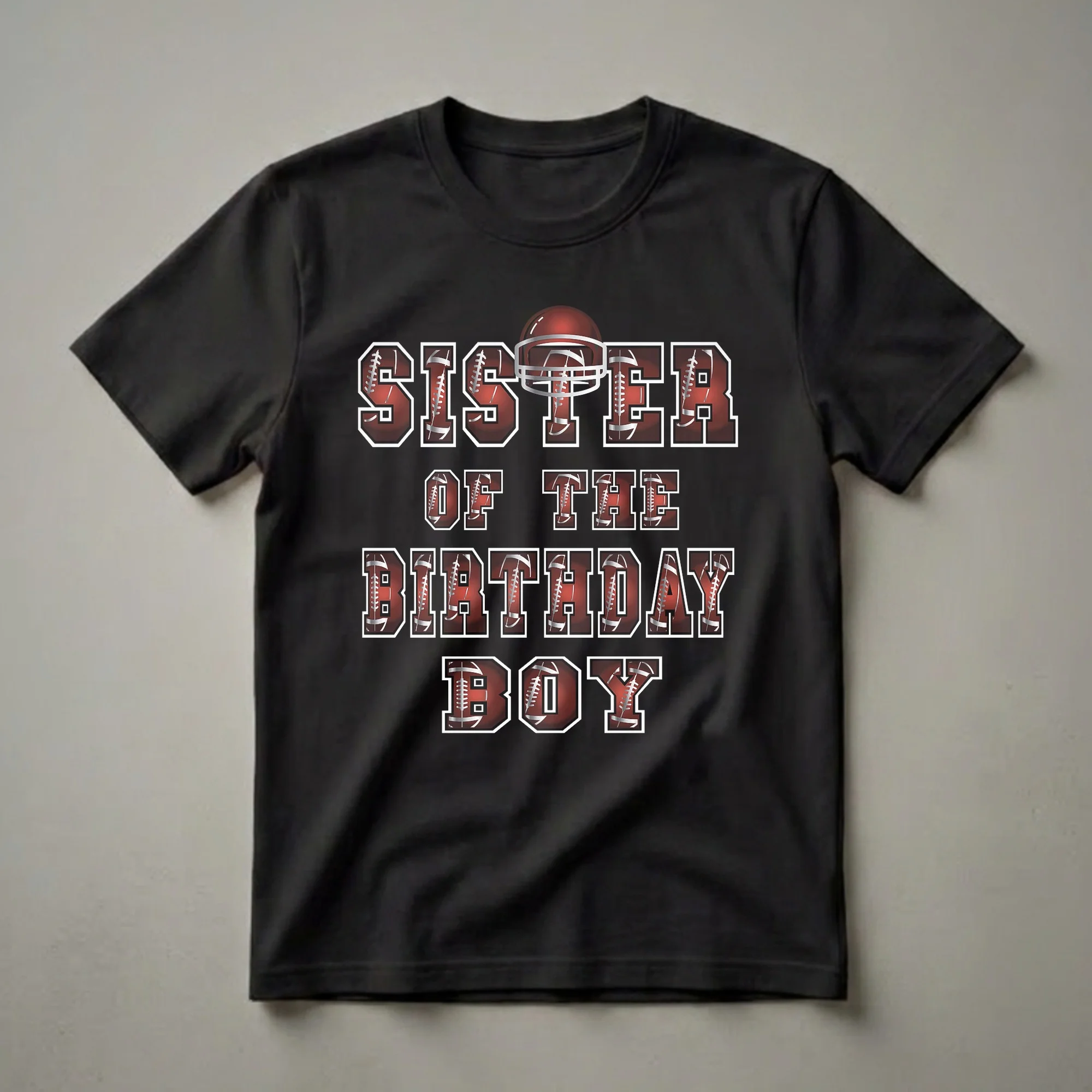 Football-loving sisters can show their team spirit with this eye-catching graphic tee. The bold text reads 'SISTER OF THE BIRTHDAY BOY,' with each letter designed to resemble a football, complete with laces and a deep red, textured surface. A metallic silver football helmet sits atop the word 'SISTER,' adding a sporty flair. This shirt is a fantastic way for a sister to support her birthday boy and join in the game-day excitement. American football is a sport deeply ingrained in many cultures, often associated with family gatherings and celebrations, making this tee a perfect fit for such occasions. Whether she's cheering from the sidelines or attending a birthday party, this t-shirt makes a statement. It's a thoughtful gift for any girl who loves football and wants to celebrate her brother's special day in style. This tee works well for birthday parties, family events, or casual wear when she wants to showcase her sibling pride and passion for the sport.