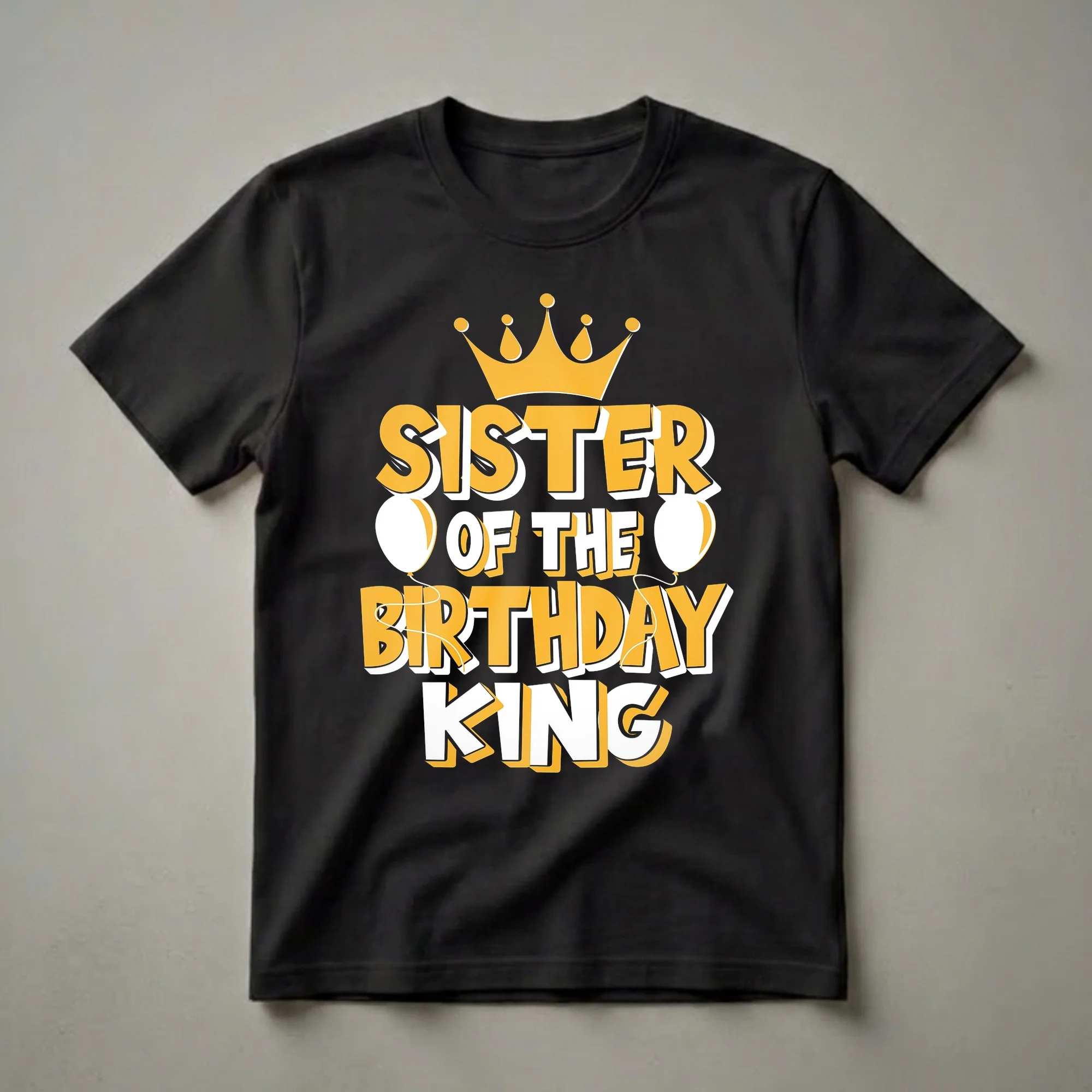 - Coordinate family birthday outfits with this "Sister of the Birthday King" matching graphic tee.