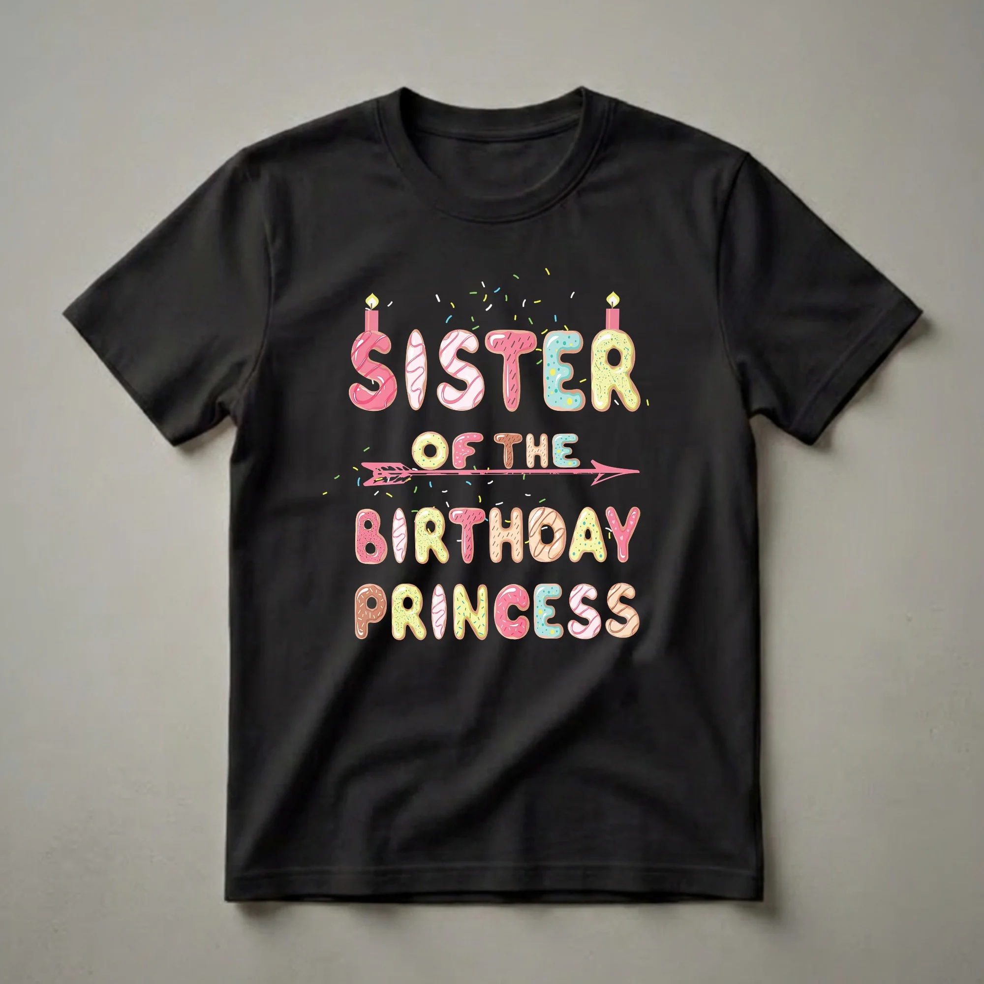 Sisterhood is a special bond, and this eye-catching tee celebrates that connection during a birthday celebration. The design features bold, colorful letters that mimic frosted donuts, complete with sprinkles and even a lit candle on the 'S' and 'R' of 'SISTER'. Below, the phrase 'OF THE BIRTHDAY PRINCESS' is also rendered in donut-style lettering, with a pink arrow piercing through the center. The bottom line proudly declares 'PRINCESS' in similarly sweet, frosted letters. This shirt is a thoughtful gift for the sister of the birthday girl, allowing her to feel part of the special occasion. It's a fun way for siblings to coordinate outfits for a birthday party, brunch, or family photos. Imagine the birthday princess and her sister, both sporting matching or complementary donut-themed apparel, creating memorable moments. This graphic tee is a playful way to show sibling pride and add a touch of sweetness to any birthday festivities, making it a go-to choice for celebrating the birthday girl and her supportive sister.