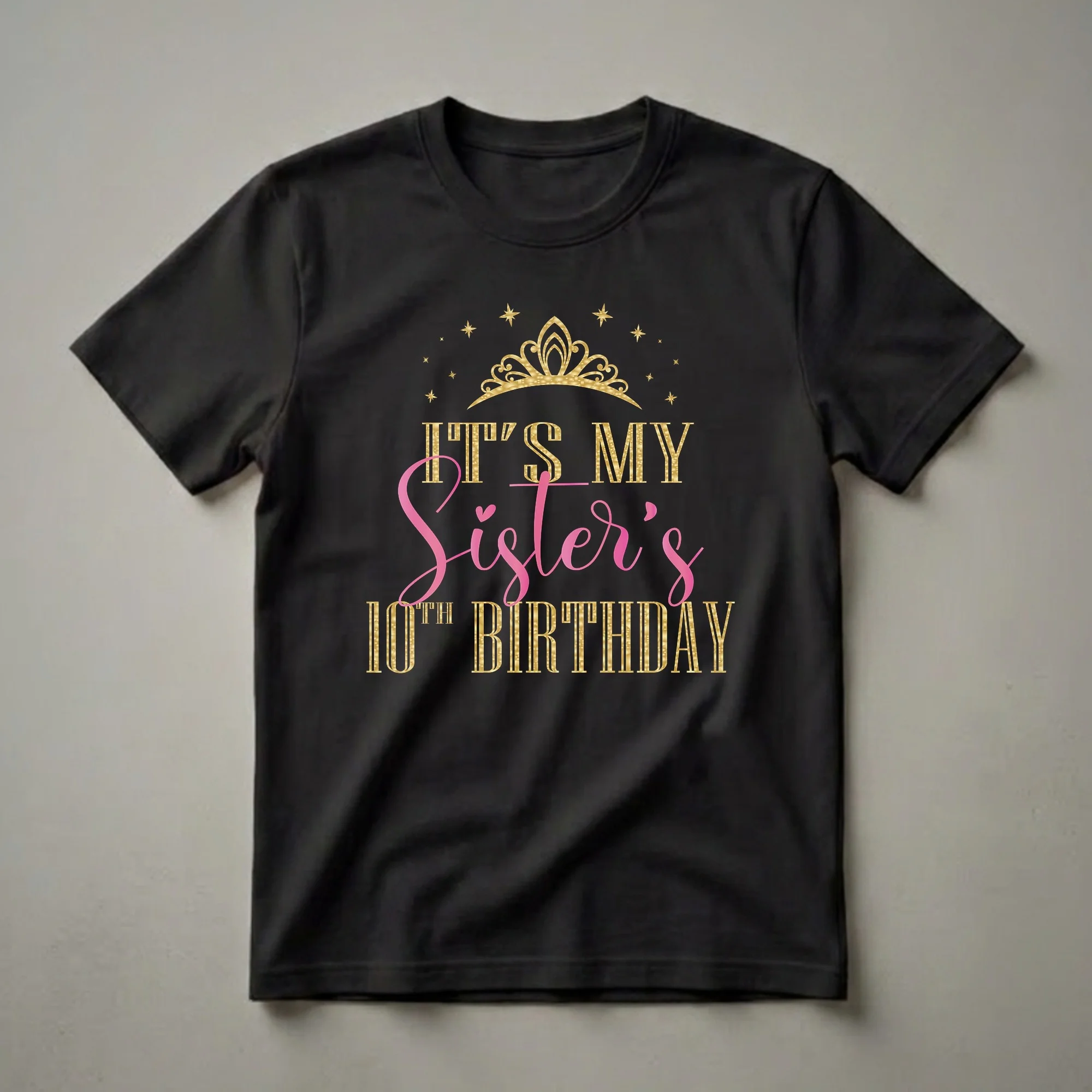 Ten years old marks a significant milestone, moving from early childhood into the pre-teen years. This special birthday deserves a celebration, and this graphic tee is designed to make the birthday girl feel like royalty. The design features a glittering gold tiara at the top, symbolizing her special day. Below it, the phrase "IT'S MY" is rendered in bold, textured gold lettering, followed by "Sister's" in a flowing, vibrant pink script. The number "10TH" is presented in a sparkling gold font, emphasizing the age, and the word "BIRTHDAY" completes the message in matching textured gold. This shirt is a thoughtful gift for any girl turning ten, especially if she loves feeling celebrated and special. It's a wonderful way for her to express her excitement about reaching this double-digit age. Imagine her wearing this t-shirt to her birthday party, brunch, or any family gathering, creating memorable moments. This eye-catching tee is a staple for any birthday girl's wardrobe, ensuring she shines on her big day. It's a fantastic way for the whole family to join in the celebration, perhaps with matching shirts for a coordinated look.