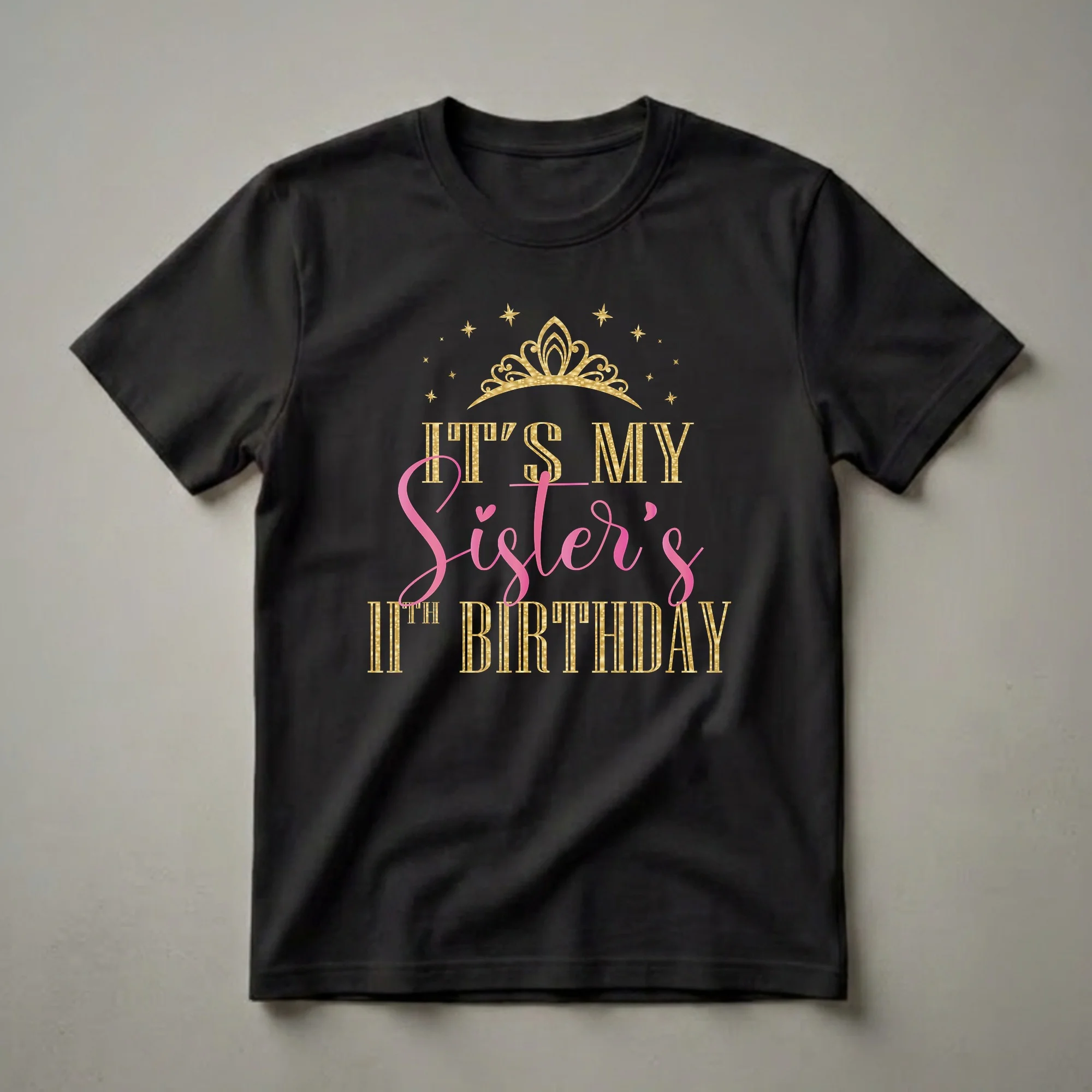Eleven is a significant milestone, marking a transition into pre-teen years, and this graphic tee is designed to celebrate that special occasion. The design features a glittering golden crown atop the text, with scattered golden stars adding a touch of magic against the black background. The phrase 'IT'S MY SISTER'S 11TH BIRTHDAY' is prominently displayed, with 'Sister's' in a flowing pink script and the rest of the text in a bold, shimmering gold font. This t-shirt is a thoughtful gift for any girl turning eleven who loves to feel like royalty on her birthday. It works well for wearing to her birthday party, a family gathering, or even just for a fun day out celebrating. The matching family aspect means siblings can join in the festive spirit, creating memorable moments. This shirt is a fantastic way for a brother or sister to show their love and excitement for their sister's big day, making her feel cherished and celebrated.