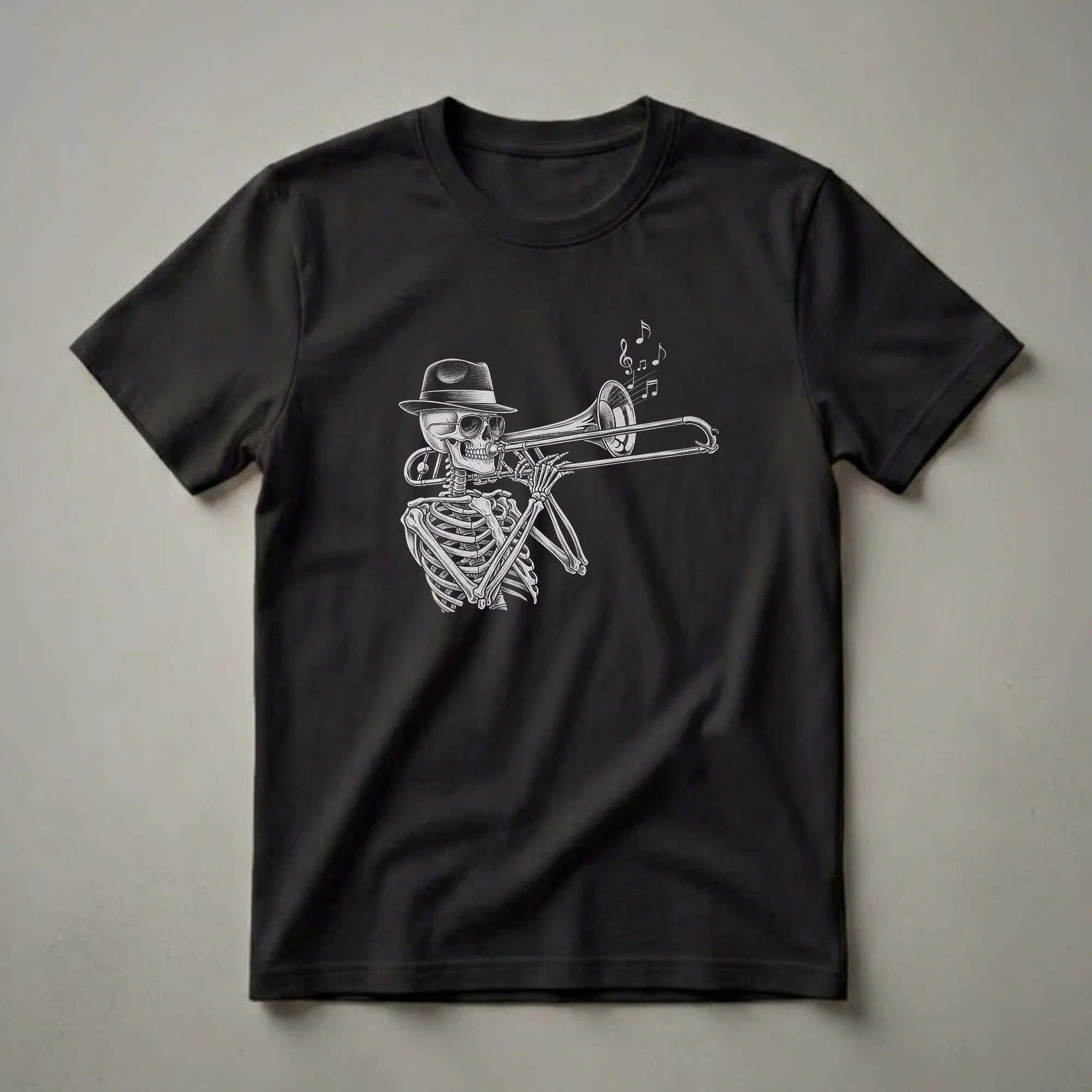 - Skeleton trombone player graphic tee for brass musicians.