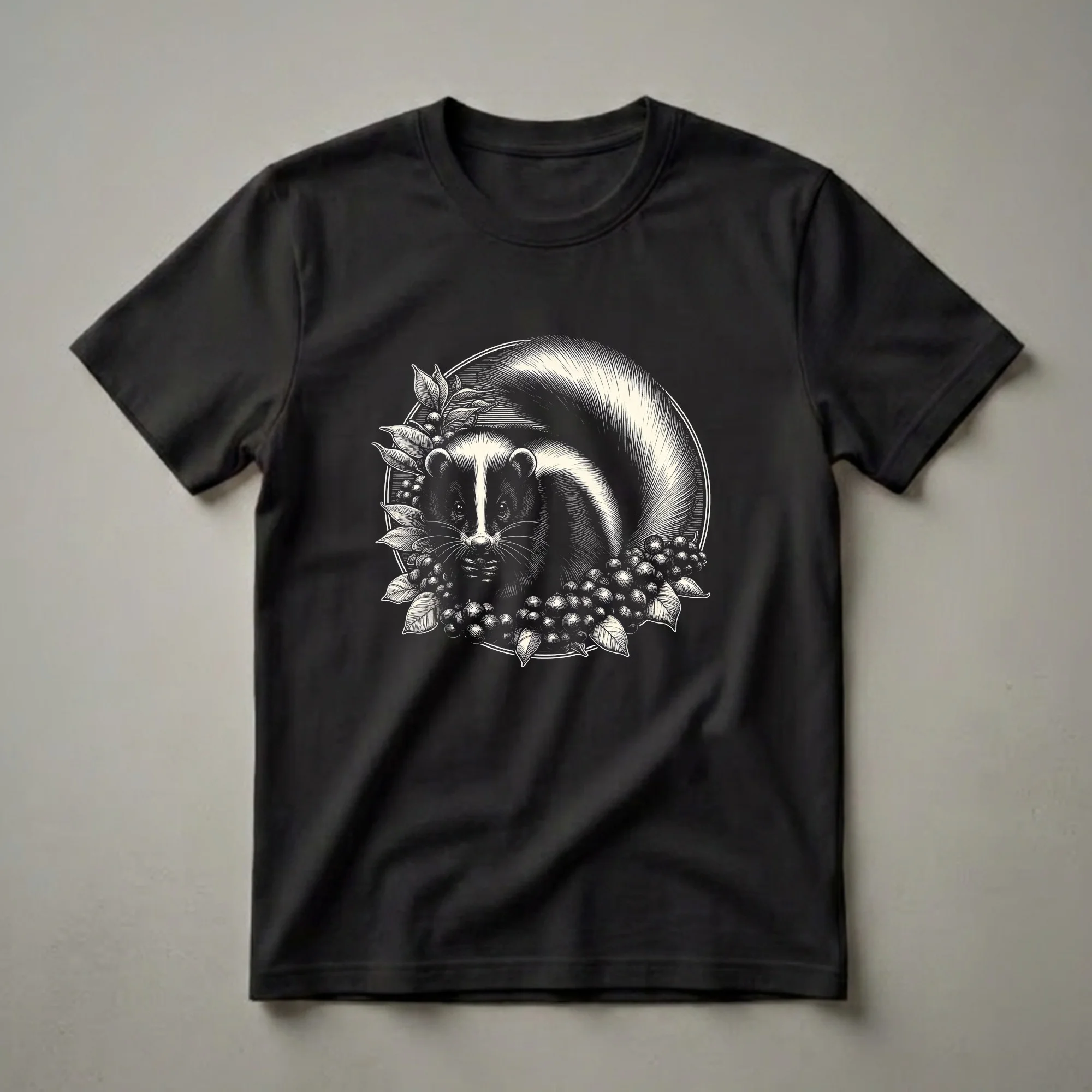 Wildlife enthusiasts and hikers will appreciate the intricate detail of this skunk graphic tee. The design features a skunk rendered in a classic engraving style, its distinctive white stripe prominent against its dark fur. It is nestled amongst a cluster of ripe berries and lush leaves, all contained within a circular border. Skunks, known for their unique defense mechanism, are often found in woodlands and forests across North America, foraging for insects, berries, and small animals. This shirt captures the essence of these often-misunderstood creatures, bringing a touch of the wild to your wardrobe. It makes a thoughtful gift for anyone who enjoys the natural world or appreciates vintage-inspired art. Wear this unique t-shirt on your next nature walk, to a casual gathering, or simply when you want to express your connection to the outdoors. This eye-catching apparel is a staple for any nature lover's collection, offering a unique way to connect with the wild.
