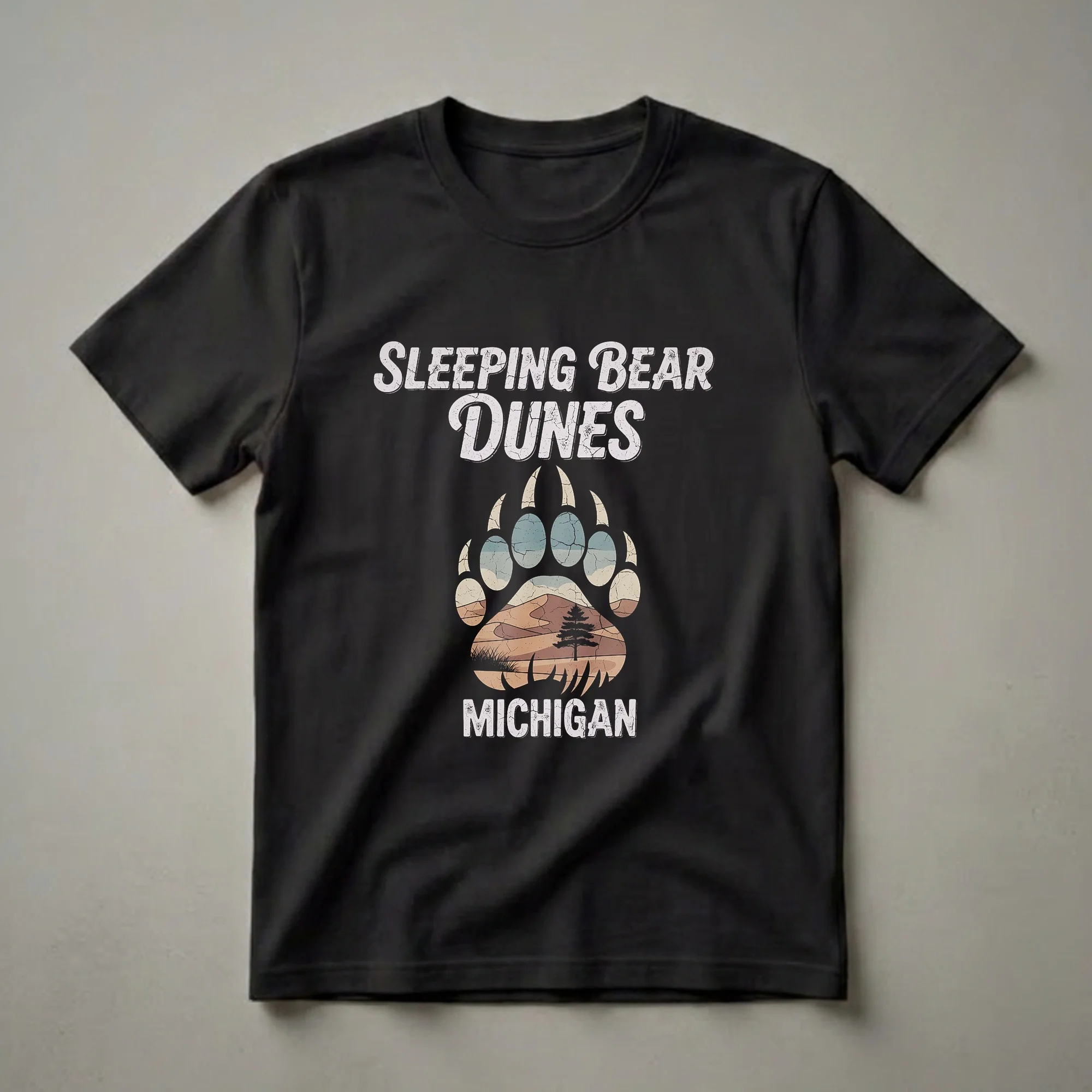Michigan travelers and nature enthusiasts will reach for this unique graphic tee, celebrating the iconic Sleeping Bear Dunes. The design features a distressed, retro aesthetic with the words "SLEEPING BEAR DUNES" emblazoned across the top. Below, a stylized bear paw print encapsulates a striking desert landscape, complete with rolling sand dunes, a lone pine tree, and tufts of grass, all rendered in a vintage color palette. The word "MICHIGAN" anchors the bottom of the design, solidifying its regional pride. Sleeping Bear Dunes National Lakeshore, located in the Lower Peninsula of Michigan along the coast of Lake Michigan, is renowned for its massive sand dunes, some reaching over 450 feet above the water. This shirt is a thoughtful gift for anyone who has explored the Pierce Stocking Scenic Drive or hiked the Dune Climb. It's a perfect way to commemorate a visit to this natural wonder or to simply express a deep connection to the Great Lakes state. Wear this t-shirt on your next road trip through Michigan or to a casual gathering with fellow state admirers.