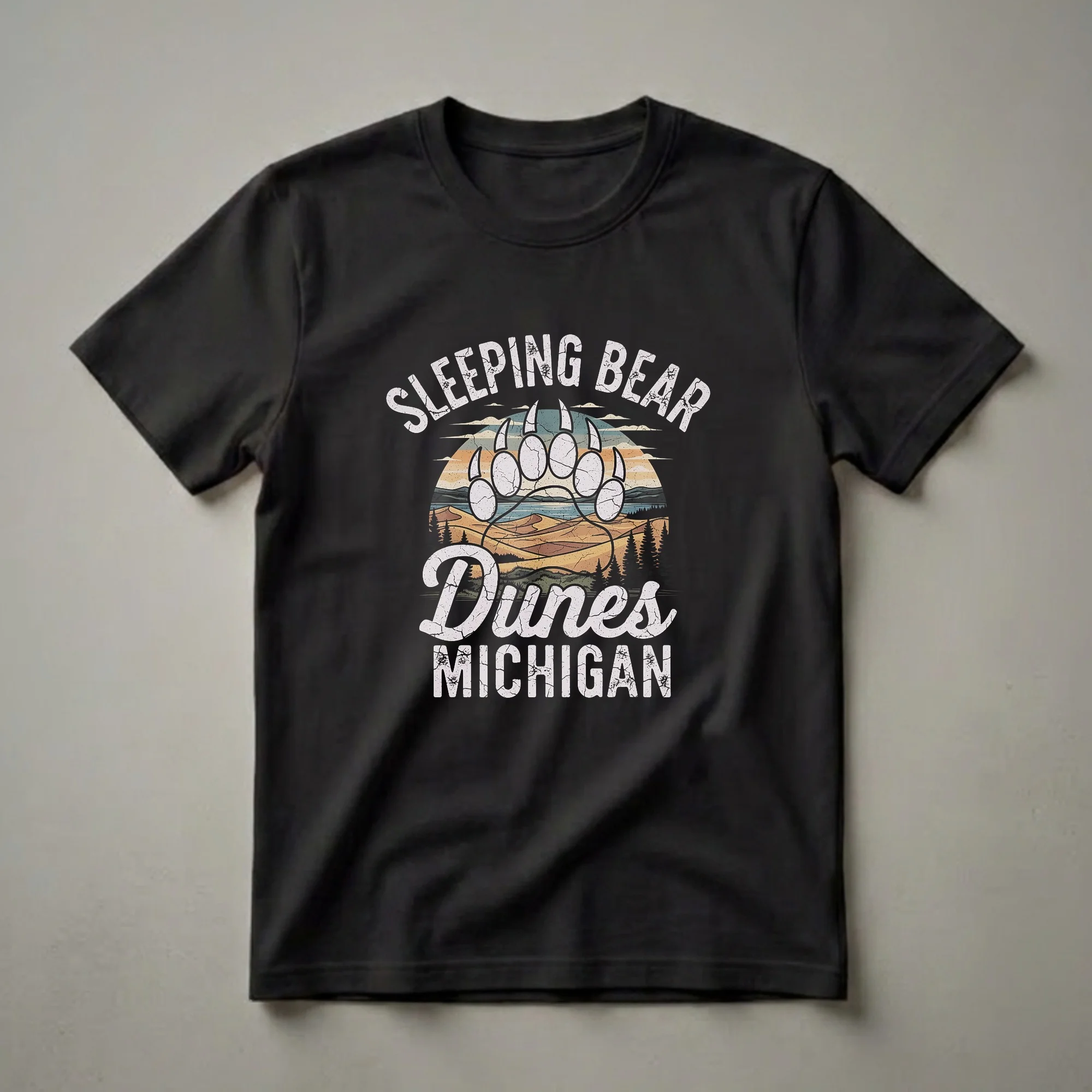 Michigan's Sleeping Bear Dunes National Lakeshore offers breathtaking vistas of towering sand dunes meeting the crystal-clear waters of Lake Michigan. This graphic tee captures that iconic scenery with a vintage-inspired design. Featuring a prominent bear paw print overlaying a stylized landscape of rolling sand dunes, pine trees, and a serene lake under a retro sunset sky, this shirt is a tribute to the natural wonder of the area. The text 'SLEEPING BEAR DUNES MICHIGAN' is emblazoned across the design in a distressed font, evoking a sense of nostalgia and adventure. This t-shirt is a go-to tee for Michigan residents, visitors, or anyone who appreciates the unique beauty of the Great Lakes region. It makes a thoughtful gift for travelers, nature enthusiasts, or those who have fond memories of exploring the sandy shores and scenic trails of this beloved national park. Wear it on your next trip to the dunes or as a reminder of your favorite Michigan getaway.