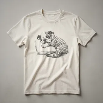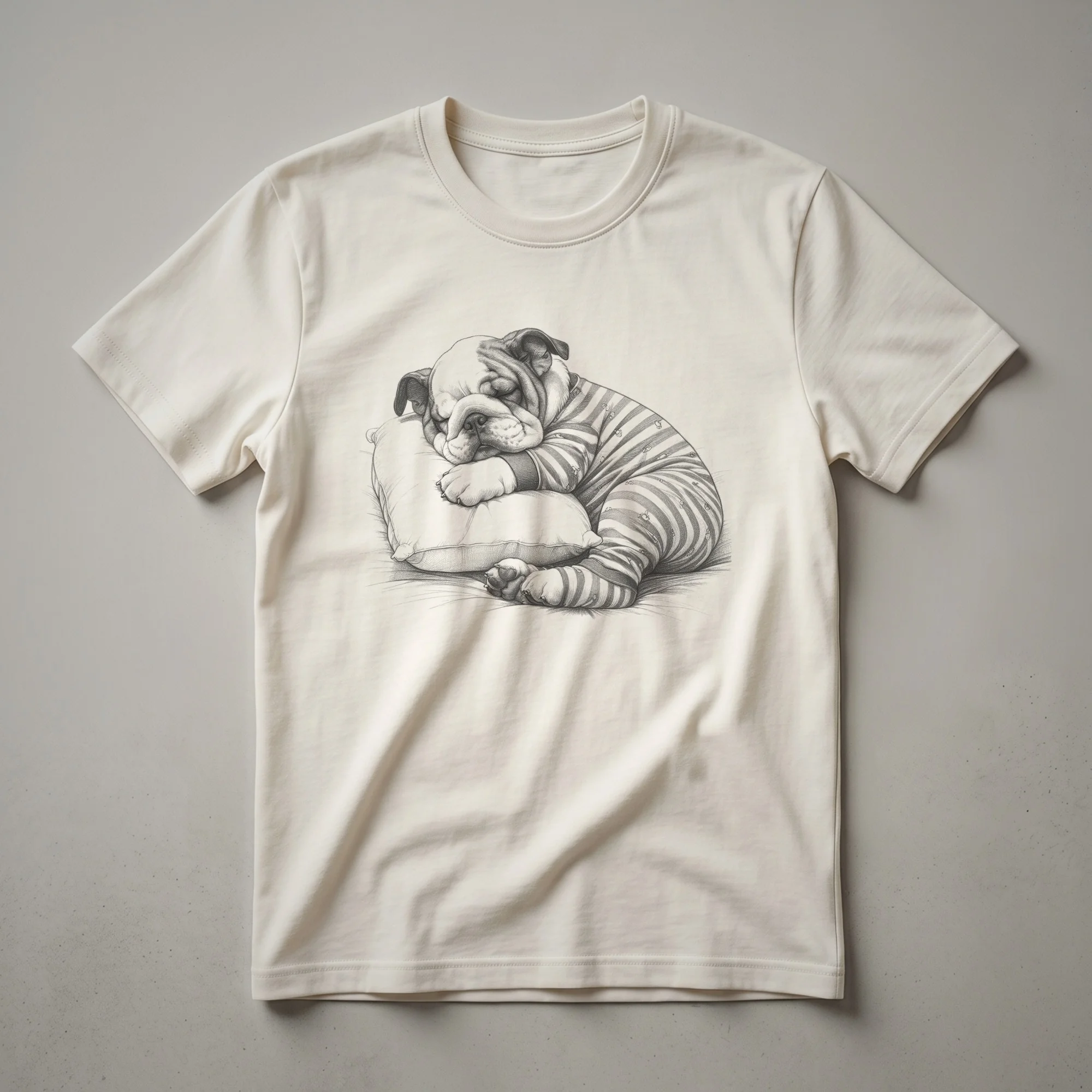 English Bulldog owners who adore their wrinkly companions will reach for this unique graphic tee. The design showcases a charming line drawing of a sleeping English Bulldog, complete with a cozy pajama outfit. This artistic representation captures the breed's famously relaxed demeanor and love for comfort. English Bulldogs, known for their distinctive appearance and gentle nature, often enjoy long naps, making this sleepy dog motif relatable for many pet parents. This t-shirt is a thoughtful gift for anyone who cherishes their bulldog or simply loves dogs that embody ultimate relaxation. It's a staple in the collection for those who appreciate canine art and comfortable apparel. Wear this shirt to your next casual outing, a dog park visit, or simply while enjoying a lazy Sunday at home with your furry friend. It’s a conversation starter for fellow dog enthusiasts and a cozy addition to any wardrobe. This comfortable tee is well suited for lounging.